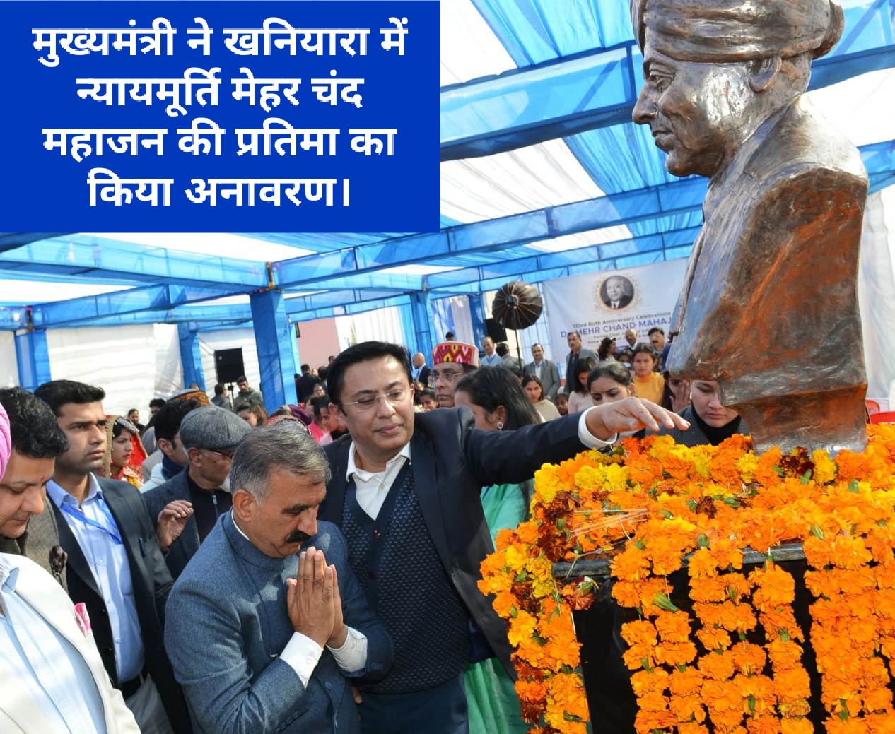 मुख्यमंत्री सुखविंदर सिंह सुक्खू ने धर्मशाला के खनियारा में सर्वोच्च न्यायालय के पूर्व मुख्य न्यायाधीश न्यायमूर्ति मेहर चंद महाजन की प्रतिमा के अनावरण के अवसर पर लोगों को संबोधित करते हुए कहा,‘न्यायमूर्ति महाजन सच्चे देशभक्त थे और जब भी हम इस प्रतिमा को देखेंगे,राष्ट्र के प्रति इनके योगदान को स्मरण करेंगे।मुझे आशा है कि हम इनकी विरासत से प्रेरित होंगे।’उन्होंने कहा कि यह हमारे लिए गर्व की बात है कि राज्य का सपूत प्रदेश के गठन से पूर्व ही देश के एक उच्च पद पर आसीन हुआ।