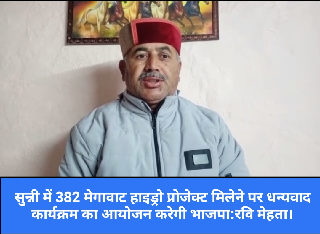 भाजपा के शिमला ग्रामीण से प्रत्याशी एवं पार्टी जिला अध्यक्ष रवि मेहता ने कहा कि शिमला ग्रामीण विधानसभा क्षेत्र में प्रधानमंत्री नरेंद्र मोदी की कैबिनेट द्वारा सुन्नी में 382 मेगावाट का हाइड्रो प्रोजेक्ट का बड़ा उपहार इस क्षेत्र को मिला है,इसके लिए हम प्रधानमंत्री नरेंद्र मोदी और केंद्र सरकार का दिल की गहराइयों से धन्यवाद करते हैं ।