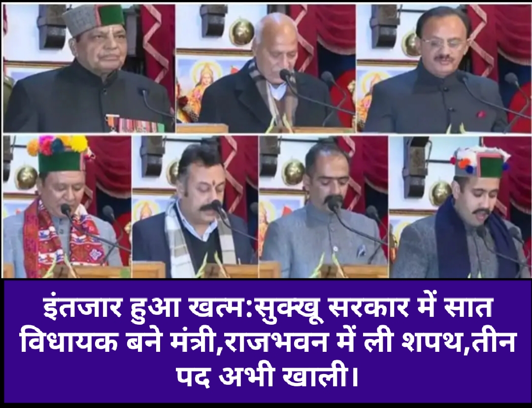 हिमाचल प्रदेश की सुखविंद्र सुक्खू सरकार में सात विधायक मंत्री बनाए गए हैं।रविवार को राजभवन शिमला में शपथ ग्रहण समारोह हुआ।मुख्य सचिव प्रबोध सक्सेना ने कार्यवाही का संचालन किया।राज्यपाल राजेंद्र विश्वनाथ आर्लेकर ने सात विधायकों को मंत्री पद की शपथ दिलाई।