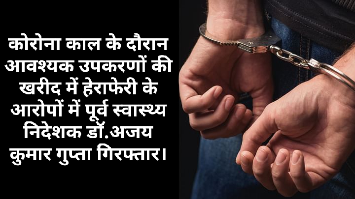 कोरोना काल के दौरान आवश्यक उपकरणों की खरीद में हेराफेरी के आरोपों में पूर्व स्वास्थ्य निदेशक डाॅ.अजय कुमार गुप्ता गिरफ्तार हो गए हैं।हाईकोर्ट से अग्रिम जमानत याचिका खारिज होने के कारण स्टेट विजिलैंस ने उन्हें गिरफ्तार किया।