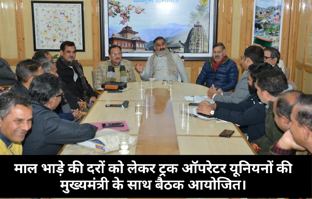 माल भाड़े की दरों को लेकर सीमेंट कम्पनी और ट्रक आॅपरेटरों के बीच जारी विवाद को दूर करने के लिए मुख्यमंत्री ठाकुर सुखविंदर सिंह सुक्खू की अध्यक्षता में विभिन्न ट्रक आॅपरेटर यूनियनों के प्रतिनिधियों के साथ देर शाम बैठक आयोजित की गई।बैठक में बिलासपुर जिले से सम्बन्धित विधायकों ने भी भाग लिया।
