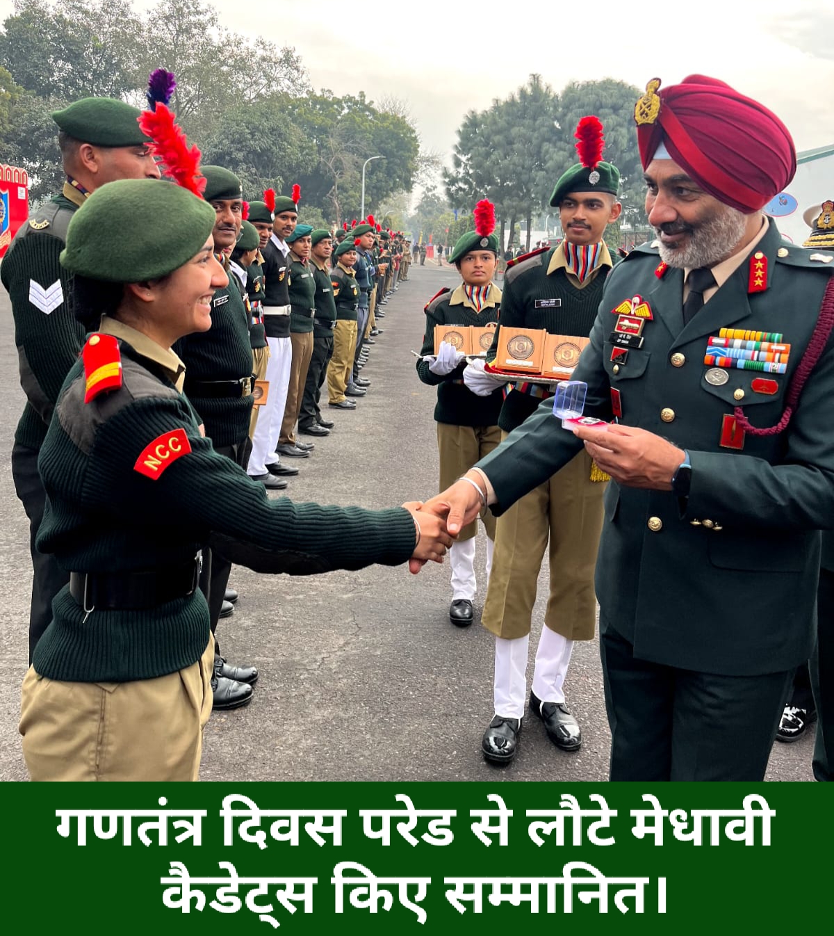 गणतंत्र दिवस पर 26 जनवरी को कर्तव्यपथ परेड दिल्ली में भाग लेकर लौटे सेवन7 एचपी एनसीसी (राष्ट्रीय कैडेट कोर)शिमला के पाँच कैडेट्स को कमान अधिकारी कर्नल डी.आर.गार्गी ने एनसीसी कार्यालय शिमला में गणतंत्र दिवस शिविर के एनसीसी कैडेटों के औपचारिक सम्मान समारोह में अपनी यूनिट सेवन एचपी (आई) कंपनी एनसीसी शिमला के इन मेधावी कैडेटों की शानदार प्रदर्शन व उपलब्धि के लिए उन्हें स्मृति-चिन्ह व प्रमाणपत्र प्रदान कर सम्मानित किया और बधाई दी।