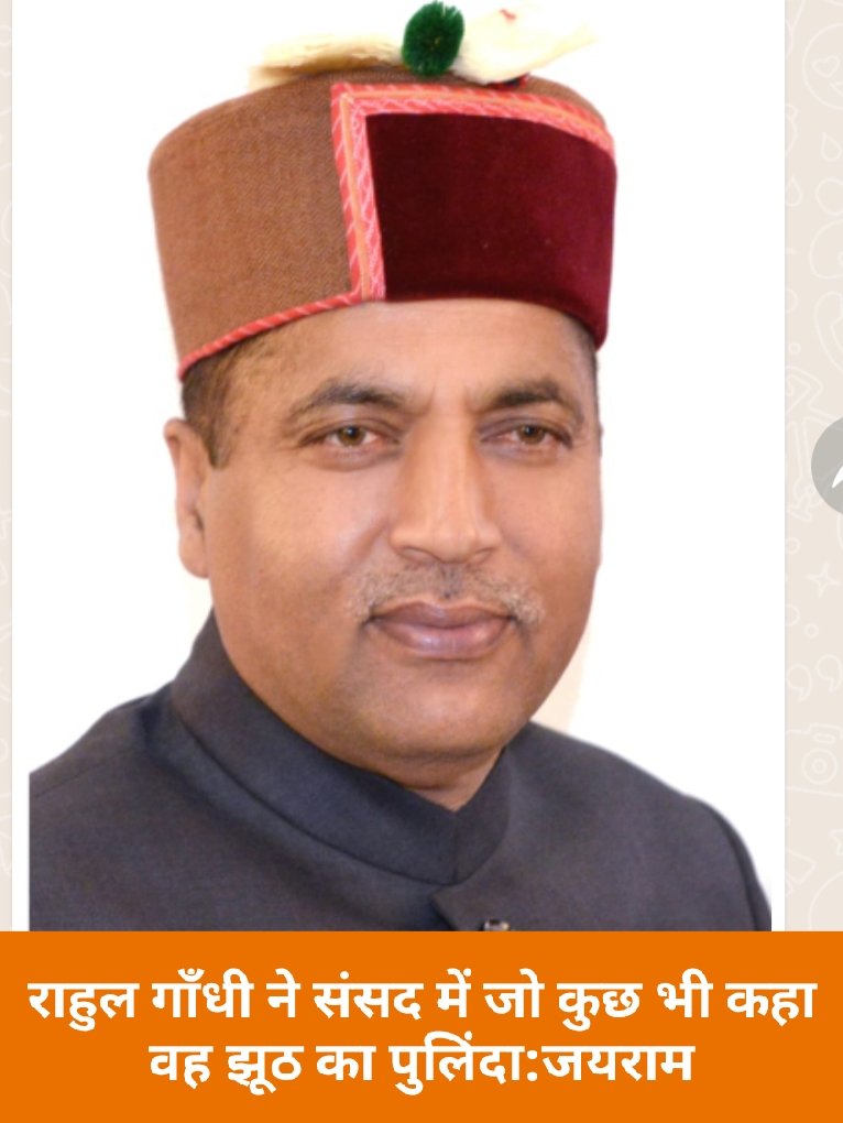 शिमला,भारतीय जनता पार्टी के नेता प्रतिपक्ष जयराम ठाकुर ने कहा की राहुल गाँधी द्वारा सदन में दिए गए अनर्गल और झूठे प्रलाप पर जम कर निशाना साधा और कांग्रेस के भ्रष्टाचार की परत-दर-परत खोलते हुए राहुल गाँधी के वक्तव्य को झूठ का पुलिंदा बताया।उन्होंने कहा की जिस प्रकार राहुल गांधी ने झूठ को सच साबित करने का असफल प्रयास कल लोकसभा में किया वह दुर्भाग्यपूर्ण है उन्होंने केवल पूरे देश में सनसनी फैलाने का प्रयास किया है।
