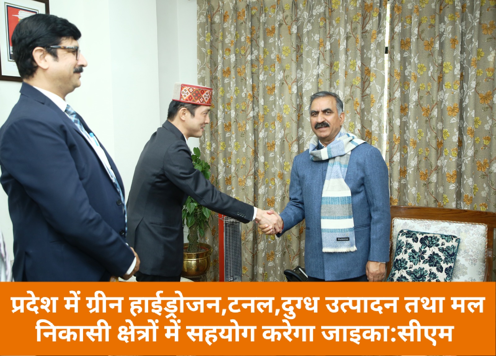 मुख्यमंत्री ठाकुर सुखविंदर सिंह सुक्खू ने नई दिल्ली में जापान इंटरनेशनल कारर्पोरेशन एजेंसी (जाइका) के साथ आयोजित बैठक में कहा कि एजेंसी हिमाचल प्रदेश में ग्रीन हाईड्रोजन,टनल, दुग्ध उत्पादन तथा मल निकासी क्षेत्रों के लिए समर्थन तथा आवश्यक राशि उपलब्ध करवाएगी।इस संबंध में शिमला में भी शीघ्र ही एक विस्तृत बैठक आयोजित की जाएगी। मुख्यमंत्री ने जाइका को विस्तृत परियोजना रिपोर्ट तैयार करने के लिए कहा ताकि इस दिशा में कार्य योजना तैयार की जा सके।उन्होेंने कहा कि हिमाचल जैसे पहाड़ी राज्य में छोटी सुरंगें सम्पर्क सुविधा प्रदान करने के साथ-साथ यात्रा के समय को कम करने मेे महत्वपूर्ण भूमिका निभाती हैैं।उन्होंने जाइका से प्रदेश में सुरंग निर्माण को भी अपनी परियोजनाओं में शामिल करने का आग्रह किया।उन्होंने कहा कि दुग्ध उत्पादन तीसरा ऐसा क्षेत्र है,जिसमें जाइका अपना सहयोग एवं तकनीक उपलब्ध करवा सकती है। इससे प्रदेश और विशेष तौर पर किसानों की आर्थिकी मंे सकारात्मक परिवर्तन लाया जा सकेगा।उन्होंने कहा कि सामुदायिक मल निकासी तथा स्वच्छता भी प्रदेश सरकार की प्रमुख प्राथमिकताओं में से एक है।