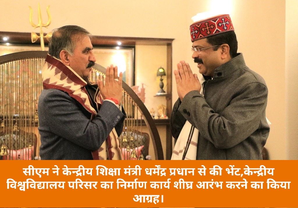 मुख्यमंत्री ठाकुर सुखविंदर सिंह सुक्खू ने नई दिल्ली में केंद्रीय शिक्षा मंत्री धर्मेंद्र प्रधान से भेंट की,मुख्यमंत्री ने केन्द्रीय विश्वविद्यालय परिसर का निर्माण कार्य शीघ्र आरंभ करने का आग्रह करते हुए कहा कि इसके लिए भूमि हस्तांतरण की प्रक्रिया पहले ही पूरी की जा चुकी है।केंद्रीय मंत्री ने मुख्यमंत्री को आश्वस्त किया कि शीघ्र ही केंद्रीय विश्वविद्यालय की आधारशिला रखकर निर्माण कार्य आरम्भ कर दिया जाएगा।