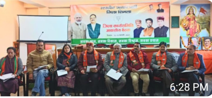 जिला शिमला की बैठक के पहले दिन उद्घाटन सत्र की अध्यक्षता भाजपा के वरिष्ठ नेता गणेश दत्त ने की,बैठक के प्रथम सत्र में पार्टी के पूर्व कार्यक्रमों की समीक्षा,सुशासन दिवस,डाटा प्रबंधन,परीक्षा पे चर्चा कार्यक्रम,मण्डलशह वृत्त जैसे कई विषय पर चर्चा हुई,बैठक में पार्टी के आगामी कार्यक्रमों की रुपरेखा तैयार की गई।भाजपा ने अपने पिछले कार्यकाल में जनहित में खोले गए संस्थानों को डी नोटिफाई करने पर कड़ा एतराज जताया और इसके लिए भाजपा इन संस्थानों को सूचिबद्ध कर प्रदेश भर में व्यापक तौर पर एक हस्ताक्षर अभियान चलाएगी।इस बैठक में मुख्य रूप से भाजपा के वरिष्ठ नेता गणेश दत्त,प्रदेश कोषाध्यक्ष संजय सूद,सचिव कुसुम सदरेट,प्यार सिंह कँवर,सह मीडिया प्रभारी करण नंदा,जिला महामंत्री गगन शर्मा,अंजना शर्मा, कार्यकारणी सदस्य रूपा शर्मा,विजय ज्योति सेन, रणदीप कँवर और शिमला के तीनों मण्डलों के अध्यक्ष उपस्थित रहे।