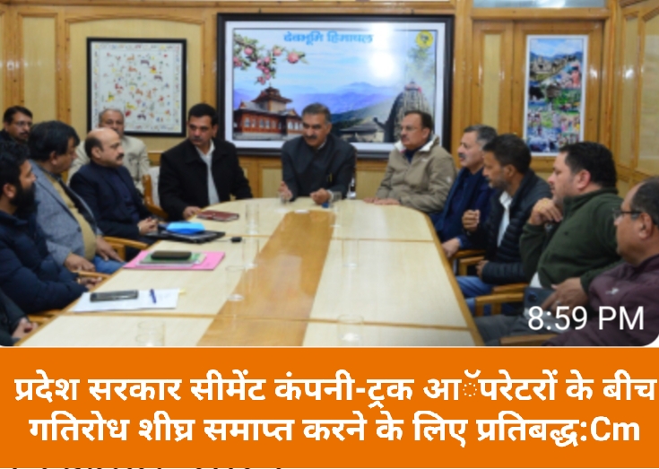सीमेंट कंपनी और ट्रक यूनियनों के बीच माल ढुलाई दरों को लेकर जारी गतिरोध को समाप्त करने के लिए मुख्यमंत्री ठाकुर सुखविंदर सिंह सुक्खू की अध्यक्षता में बैठक आयोजित हुई।बैठक में माल ढुलाई दरों को लेकर विस्तृत चर्चा की गई।मुख्यमंत्री ठाकुर सुखविंदर सिंह सुक्खू ने कहा कि राज्य सरकार प्रदेश के ट्रक आॅपरेटरों के अधिकारों की रक्षा के लिए प्रतिबद्ध है। इस गतिरोध को इस तरह सुलझाने का प्रयास किया जा रहा है कि दोनों पक्षों को कोई नुकसान न हो। उन्होंने गतिरोध समाप्त करने पर बल देते हुए कहा कि दोनों पक्षों को इस मुद्दे को सौहार्दपूर्ण तरीके से सुलझाना चाहिए।सरकार इस मामले को अति शीघ्र सुलझाने के लिए प्रयासरत है और मुख्यमंत्री ने इस गतिरोध को समाप्त करने के लिए मंगलवार को शिमला में कंपनी के उच्च अधिकारियों और ट्रक यूनियनों के प्रतिनिधियों के साथ बैठक बुलाई है।