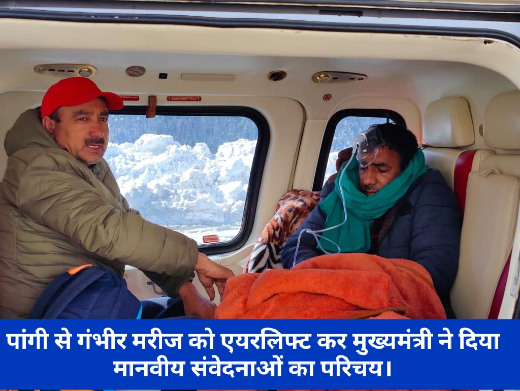 मुख्यमंत्री ठाकुर सुखविंदर सिंह सुक्खू को यह सूचना प्राप्त हुई कि चंबा जिला के पांगी स्थित किलाड़ में एक व्यक्ति के स्वास्थ्य की स्थिति बहुत गंभीर है और उसे तुरंत विशेषज्ञ उपचार की आवश्यकता है,लेकिन पांगी में भारी बर्फबारी के कारण उसे सड़क के रास्ते अस्पताल पहुंचाना संभव नहीं हो पा रहा है।आपात स्थिति में मरीज को हेलिकाॅप्टर से ही टांडा अस्पताल में पहुंचाया जा सकता था।