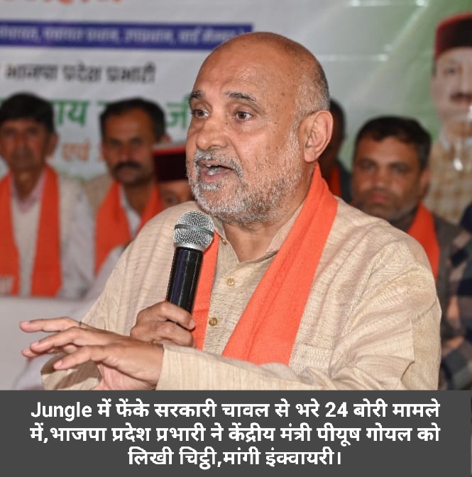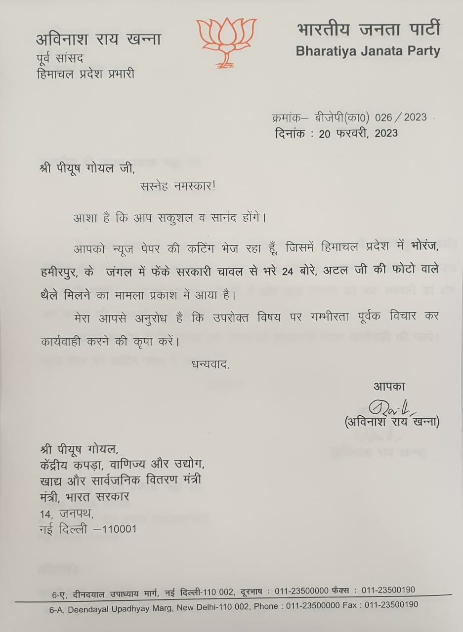 शिमला,भाजपा प्रदेश प्रभारी अविनाश राय खन्ना ने केंद्रीय कपड़ा वाणिज्य और उद्योग,खाद्य और सार्वजनिक वितरण मंत्री पीयूष गोयल को एक पत्र लिखा।पत्र में अविनाश राय खन्ना ने पीयूष गोयल को अवगत करवाया कि भोरंज विधानसभा क्षेत्र जिला हमीरपुर के जंगल में फेंके सरकारी चावल से भरे 24 बोरी जिनपर पूर्व प्रधानमंत्री अटल बिहारी वाजपेई की फोटो लगी थी उसका मामला सामने आया है।
