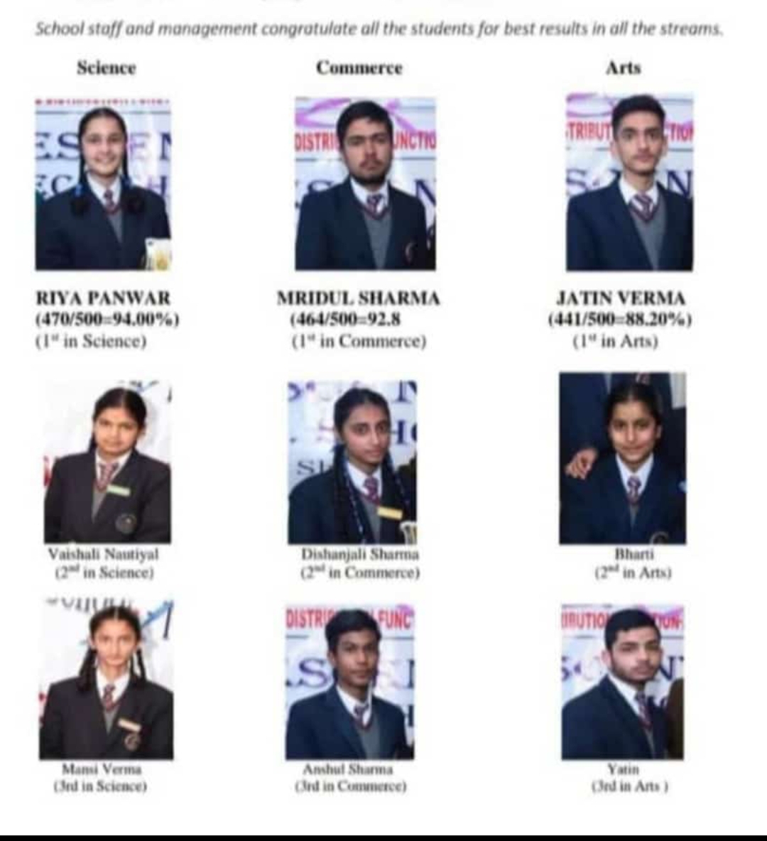 स्कूल के छात्रों ने हिमाचल प्रदेश स्कूल शिक्षा बोर्ड की 12वीं कक्षा की परीक्षा में कडी मेहनत के बलबूते शानदार परिणाम हासिल किया।तीनों संकायों में बच्चों ने अच्छे अंक हासिल किए हैं,विज्ञान संकाय में रिया पंवर ने 500 में से 470 (94%)अंक लेकर पहला स्थान हासिल किया।विज्ञान संकाय में दूसरे स्थान पर वैशाली नौटियाल और तीसरे स्थान पर मानसी वर्मा रही।