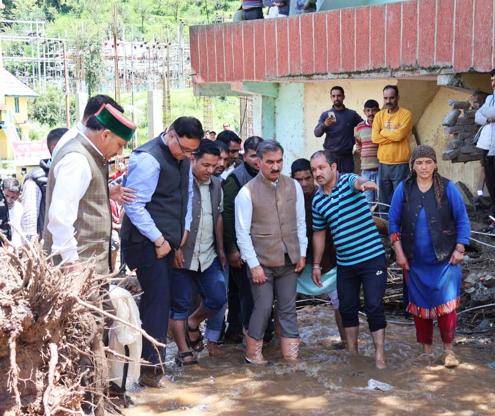 Chief Minister Thakur Sukhvinder Singh Sukhu visited the flood-hit Thunag Sub-division in Seraj constituency of district Mandi and took stock of the situation at Thunag market which was severely affected by the flood.He announced to provide rupees one lakh each to the affected families and also directed to channelize the Thunag rivulet so as to avoid such type of mishaps.