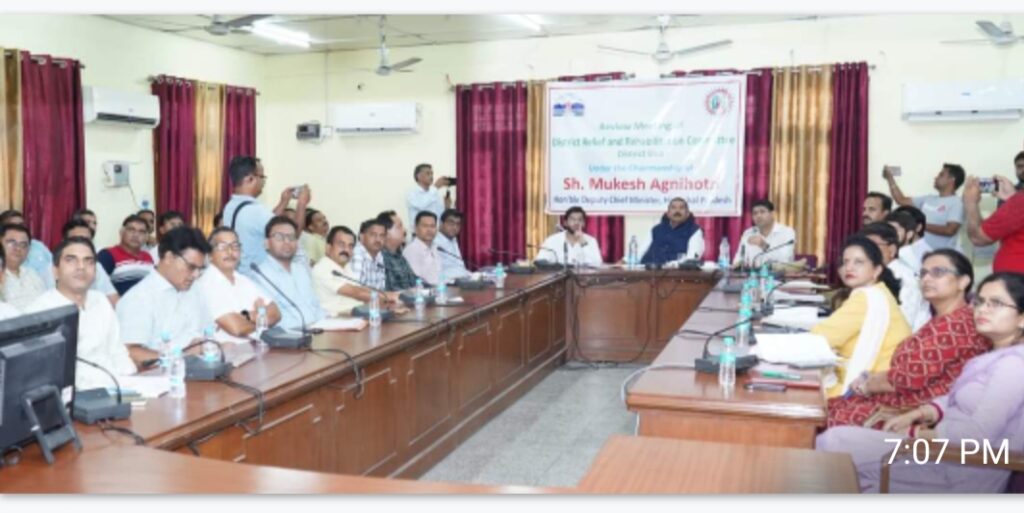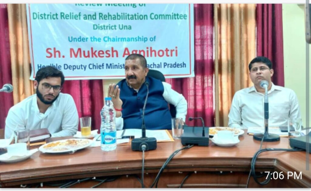 Una:लोगों के कल्याण के लिए समर्पित प्रदेश सरकार आपदा प्रभावित क्षेत्रों में पुनर्वास कार्य युद्धस्तर पर कर रही है।राहत एवं पुनर्वास कार्यों को तीव्र गति से चलाया जा रहा है।यह बात उप मुख्यमंत्री मुकेश अग्निहोत्री ने डीआरडीए सभागार में जिला राहत एवं पुनर्वास समिति की बैठक की अध्यक्षता करते हुए कही।उन्होंने कहा कि प्रदेश में हुई भारी बारिश,बाढ़ व भूस्खलन के कारण हुए नुक्सान का आंकलन करने के लिए सभी जिलों में राहत पुनर्वास कार्यों की समीक्षा के लिए जिला स्तरीय राहत एवं पुनर्वास समितियों का गठन किया गया है।