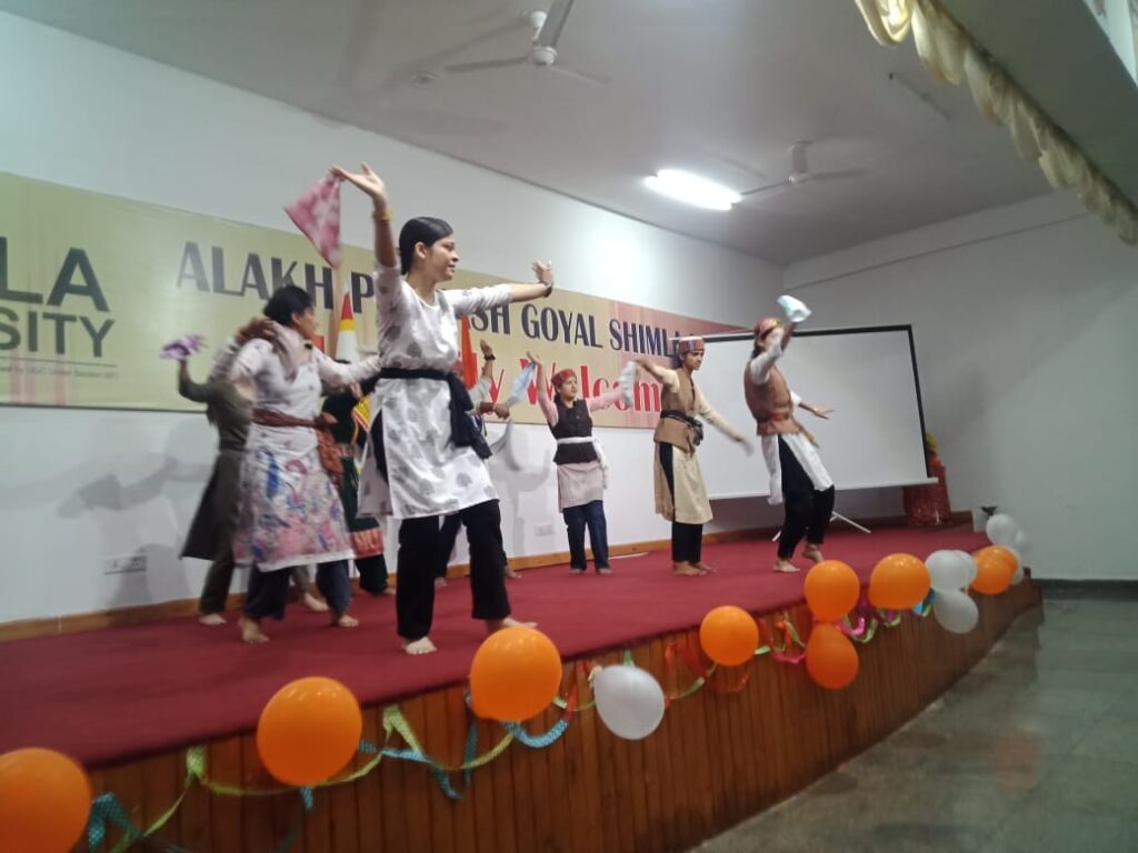 APG शिमला विश्वविद्यलय के छात्रों के नए बैच को विश्वविद्यलय में बिल्कुल नया अनुभव मिला,क्योंकि नए प्रथम वर्ष के छात्रों के स्वागत और फ्रेशर पार्टी के लिए एपीजी विश्वविद्यलय की ओर से सर्व समावेशी रंगारंग सांस्कृतिक कार्यक्रम और खेलकूद प्रतियोगिता का आयोजन किया गया जिसमें नए और पुराने छात्रों ने बढ़चढ़कर भाग लिया।एपीजी विश्वविद्यलय के सभागार में पुराने छात्रों ने नए छात्रों का गर्म जोशी से स्वागत किया।कार्यक्रम में लगभग तीन सौ छात्रों ने भाग लिया और नृत्य,गायन,संगीत, हिमाचली पहाड़ी नाटी,नाट्य कला में अपनी प्रतिभा का प्रदर्शन किया और एक ही मंच पर भारत के विभिन्न राज्यों और विदेशी छात्रों द्वारा रंगारंग सांस्कृतिक प्रस्तुतियां पेश की गई और सभागार में उपस्थित प्राध्यापकगण,अतिथियों ने छात्रों की प्रतिभा को खूब सराहा।नए छात्रों और पुराने छात्रों ने विभिन्न राज्यों के परिधानों में सांस्कृतिक प्रस्तुतियां देकर समा बांधा।पुराने छात्रों ने गणेश वंदना,सरस्वती वंदना व स्वागत गीतों के अलावा हिमाचली पहाड़ी गीत,पंजाबी,हिंदी, अंग्रेज़ी और अन्य राज्यों के गीत प्रस्तुतियों ने सभी का मन मोह लिया।