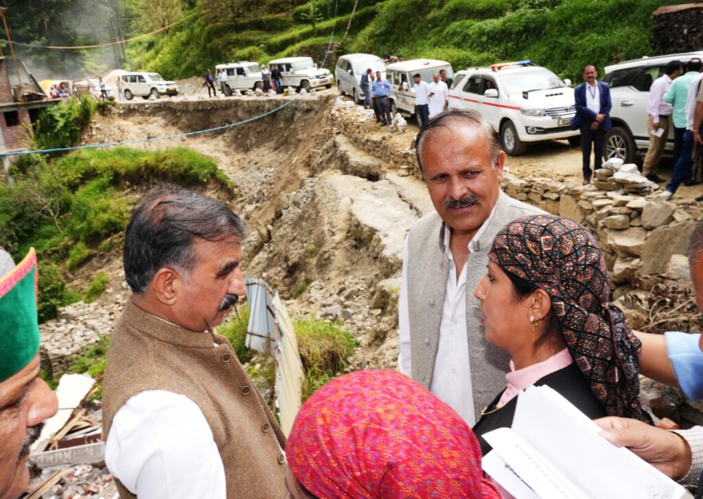 CM ठाकुर सुखविंदर सिंह सुक्खू ने बुधवार को रामपुर विधानसभा क्षेत्र की विभिन्न पंचायतों में बारिश से हुए भारी नुकसान का निरीक्षण किया।स्थानीय लोगों ने उन्हें आपदा से अवरुद्ध हुई सड़कों,बाधित पेयजलापूर्ति,मकानों को पहुंचे नुकसान के बारे में अवगत कराया।ग्राम पंचायत ननखड़ी में महिलाओं की सड़क मार्ग बहाल करने की मांग पर मुख्यमंत्री ने कहा कि वह उनका दुःख-दर्द समझते हैं,अवरुद्ध पड़े रास्तों को खोलने के लिए पंचायतों को भी आवश्यक धनराशि जारी की जा रही है।उन्होंने कहा कि लोक निर्माण विभाग सड़कों को बहाल करने के लिए युद्ध स्तर पर कार्य कर रहा है।
