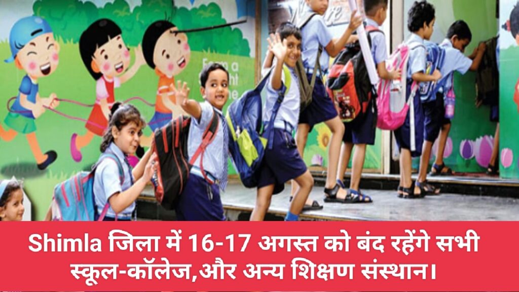 Shimla जिले के सभी शिक्षण संस्थान 16 और 17 अगस्त को भी बंद रहेंगे।जिला दंडाधिकारी एवं उपायुक्त शिमला आदित्य नेगी ने इस संबंध में आदेश जारी किए हैं।जिले में बारिश और भूस्खलन के कारण अवरुद्ध सड़कों को देखते हुए यह निर्णय लिया गया है।16 और 17 अगस्त को सभी निजी और सरकारी शिक्षण संस्थानों,व्यावसायिक प्रशिक्षण केंद्रों और आंगनवाड़ी केंद्रों में छुट्टी रहेगी।उपायुक्त ने सभी शिक्षण संस्थानों के प्रमुखों से आदेशों की अनुपालन सुनिश्चित बनाने को कहा है।