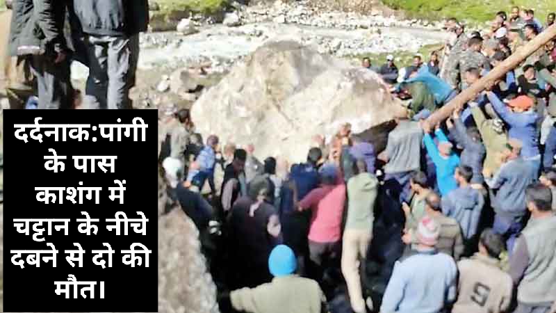 जिला किन्नौर के पांगी में काशंग नामक स्थान पर चट्टान के नीचे दबने से महिला व पुरुष की मौत हो गई।हादसा बीते मंगलवार शाम को पेश आया।मृतकों की पहचान हरीश कुमार (59) पुत्र देवा धन निवासी पांगी तहसील कल्पा, जिला किन्नौर और पार्वती देवी (54) पत्नी सोहन सिंह निवासी पांगी,तहसील कल्पा,जिला किन्नौर के रूप में हुई है। बुधवार दोपहर तक ग्रामीणों और पुलिस के सहयोग से चट्टान को हटाकर शवों को निकाल लिया गया है।