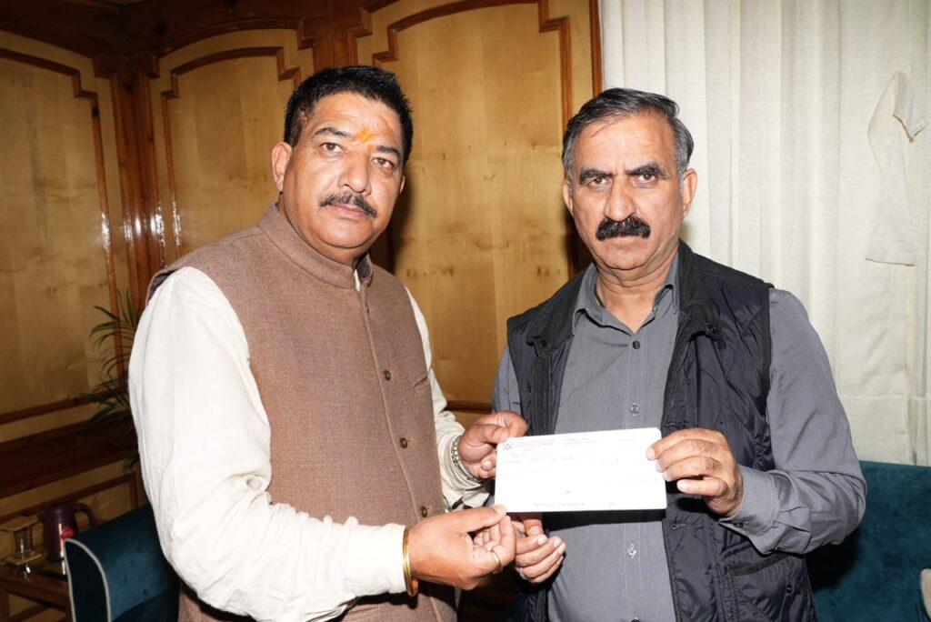 Chairman Himachal Pradesh State Cooperative Bank Devender Shyam presented a cheque of rupees three lakh as a contribution towards Aapda Rahat Kosh, from his own savings to Chief Minister Thakur Sukhvinder Singh Sukhu here today.Thanking him for the noble gesture the Chief Minister said that people from all walks of life were coming forward for contributing voluntarily towards the Disaster Relief Fund, as a help for the families affected by the disaster.