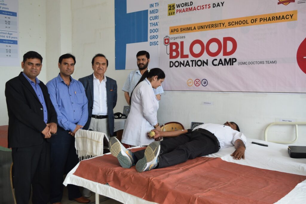 APG शिमला विश्वविद्यालय परिसर में स्कूल ऑफ फार्मेसी और इंदिरा गांधी मेडिकल कॉलेज शिमला की ब्लड बैंक टीम के संयुक्त तत्त्वाधान में विश्व फार्मेसी दिवस के उपलक्ष्य में विश्वविद्यालय में रक्तदान शिविर का आयोजन किया गया। रक्तदान शिविर का शुभारंभ एपीजी विश्वविद्यालय के पूर्व कुलपति व चेयरमैन प्रो.डॉ.आर.के.चौधरी ने किया,जबकि एपीजी शिमला विश्वविद्यालय के चांसलर इंजीनियर सुमन विक्रांत और प्रो-चांसलर प्रो.डॉ.रमेश चौहान,कुलसचिव डॉ.अनिल कुमार पाल,डीन अकैडमिक प्रो. डॉ.आनंदमोहन शर्मा भी रक्तदान शिविर में पहुंचकर रक्तदानियों से भेंटकर उनका इस महादान के लिए आभार जताया। विश्वविद्यालय के चेयरमैन प्रो.आर.के. चौधरी ने स्वयं रक्तदान कर रक्तदान महादान का संदेश दिया।कार्यक्रम सुबह 11:00 बजे से शाम 4:00 बजे तक चला और इसमें एपीजी शिमला विश्वविद्यालय के इछुक छात्र-छात्राओं,शिक्षकों,कर्मचारियों और स्थानीय निवासियों ने रक्तदान में भाग लिया और बालिका छात्राओं ने भी रक्तदान में जागरूकता दिखाई। रक्तदान शिविर में इन्दिरा गांधी मेडिकल कॉलेज शिमला से डॉक्टर विपाशा व्यास,स्टाफ नर्स व सिस्टर निशिता और उनके सहयोगी कमलजीत और मेडराम ने सफलतापूर्वक रक्तदान शिविर में रक्तदाताओं से रक्तदान करवाने में अपना बहुमूल्य सहयोग दिया।इस रक्तदान शिविर में डॉक्टरों की टीम ने रक्तदाताओं के रक्त-ग्रुप की जाँच कर रक्तदान करवाया।रक्तदान शिविर में 41 यूनिट रक्त इक्ट्ठा किया गया। डॉक्टरों ने बताया कि स्वस्थ लोगों द्वारा रक्त दान करने से दिल की सेहत में सुधार,दिल की बीमारियों और स्ट्रोक के खतरे को कम माना जाता है।खून में आयरन की ज्यादा मात्रा दिल के दौरे के खतरे को बढ़ा सकती है।नियमित रूप से रक्तदान करने से आयरन की अतिरिक्त मात्रा नियंत्रित हो जाती है।जो दिल की सेहत के लिए अच्छी है।विश्वविद्यालय के चेयरमैन प्रो.डॉ.आर.के. चौधरी ने बताया कि कई बार मरीजों के शरीर में खून की मात्रा इतनी कम हो जाती है कि उन्हें किसी और व्यक्ति से ब्लड लेने की आवश्यकता पड़ जाती है।ऐसी ही इमरजेंसी स्थिति में खून की आपूर्ति के लिए लोगों को रक्तदान करने के लिए आगे आना चाहिए।इससे जरुरत मंद की मदद हो सकेगी। प्रो.चौधरी ने कहा कि रक्तदान से बड़ा कोई महादान नहीं हैं क्योंकि यह जरूरमंद व खून की कमी से जुझ रहे लोगों की जान बचाने में मदद करता है और यही मानवधर्म भी है।प्रो.डॉ.आर.के. चौधरी ने स्कूल ऑफ फार्मेसी के रक्तदान शिविर आयोजित करने के प्रयासों की सराहना करते हुए विश्व फार्मेसी दिवस की शुभकामनाएँ भी दीं और इंदिरा गांधी मेडिकल कॉलेज की डॉक्टरों की टीम को उनके योगदान के लिए धन्यवाद किया।प्रो.चौधरी ने कहा कि एपीजी शिमला विश्वविद्यालय नियमित