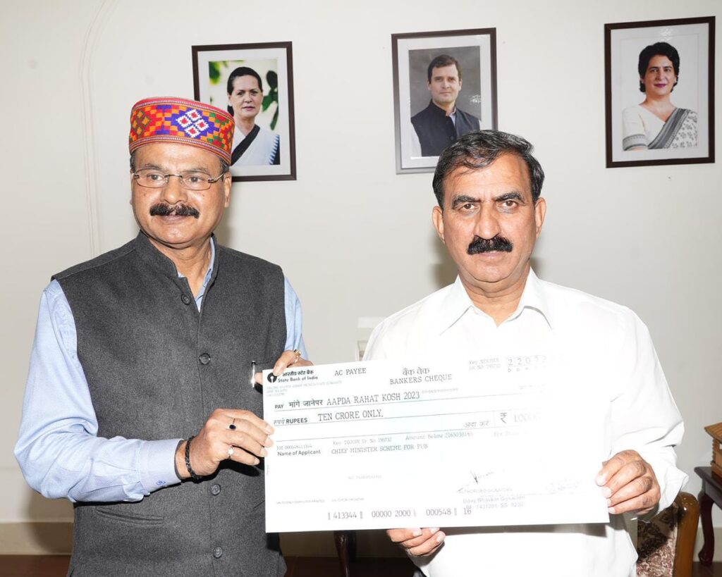 Chief Minister Thakur Sukhvinder Singh Sukhu has thanked the government of Assam for donating Rs.10 crore towards Aapda Rahat Kosh-2023 saying that it will go a long way in aiding relief measures being undertaken by Himachal Pradesh for the ones hardly hit by the heavy rains, floods and landslides during the recent monsoon season. A cheque in this regard was presented to the Chief Minister by Forest Minister of Assam Chander Mohan Patowary here today.Thakur Sukhvinder Singh Sukhu has thanked the Assam government for providing aid at this difficult hour. He said that this amount will be helpful in providing relief to the suffering families.Sukhu also thanked Assam Chief Minister Dr.Himanta Biswa Sarma for providing assistance at the times when Himachal was emerging back from the devastation and helping the affected families to come out of the trauma.