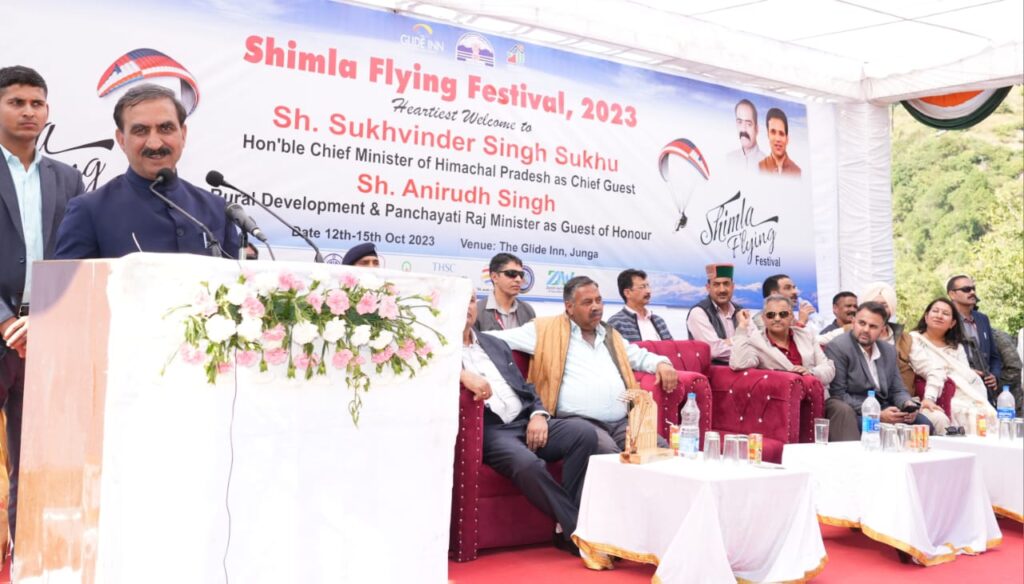 CM ठाकुर सुखविंदर सिंह सुक्खू ने आज से 15 अक्तूबर,2023 तक शिमला जिला के कसुम्पटी विधानसभा क्षेत्र के जुन्गा में आयोजित शिमला फ्लाइंग फेस्टिवल का शुभारंभ किया।इस अवसर पर ठाकुर सुखविंदर सिंह सुक्खू ने कहा कि ऐसे आयोजनों से क्षेत्र में पर्यटन गतिविधियों को बढ़ावा मिलता है,जिससे स्थानीय लोगों को रोजगार के प्रत्यक्ष एवं अप्रत्यक्ष अवसर उपलब्ध होते हैं।उन्होंने कहा कि कांगड़ा जिला का बीड़-बिलिंग क्षेत्र पैराग्लाइडिंग के लिए दुनियाभर में प्रसिद्ध है।प्रदेश सरकार हिमाचल के वातावरण के अनुकूल हरित उद्योगों को बढ़ावा दे रही है,जिसमें पर्यटन भी शामिल है।मुख्यमंत्री ने कहा कि सरकार ने प्रदेश में पर्यटन विकास के लिए व्यापक योजना तैयार की है।कांगड़ा को पर्यटन राजधानी बनाने की घोषणा के साथ ही अन्य अनछुए गंतव्यों को विकसित किया जाएगा।साहसिक पर्यटन को बढ़ावा देने में इस तरह के आयोजन सहायक सिद्ध होंगे।