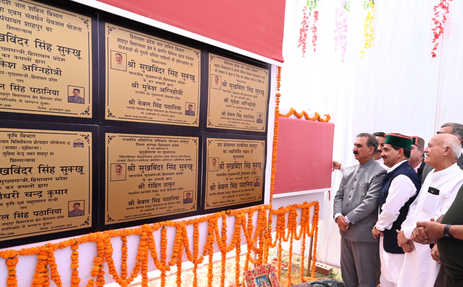 CM ठाकुर सुखविंदर सिंह सुक्खू ने जिला कांगड़ा के शाहपुर विधानसभा क्षेत्र के एक दिवसीय प्रवास के दौरान 76 करोड़ 57 लाख रुपये के विकास कार्यों के उद्घाटन तथा शिलान्यास किए।इस दौरान उन्होंने शाहपुर में 56.56 करोड़ रुपये की लागत से निर्मित होने वाली मल निकासी योजना एवं संवर्द्धन पेयजल योजना नगर पंचायत शाहपुर का शिलान्यास किया।उन्होंने 13.71 करोड़ रुपये की लागत से शाहपुर विधानसभा के अंतर्गत विभिन्न योजनाओं में पानी की गुणवत्ता में सुधार के लिए जल प्रशोधन संयंत्र का शिलान्यास भी किया।मुख्यमंत्री ने शाहपुर विधानसभा क्षेत्र के अंतर्गत 5 करोड़ रुपये की लागत से विभिन्न उठाऊ पेयजल योजनाओं की पुरानी पम्पिंग मशीनरी के प्रतिस्थापना कार्य का शिलान्यास किया।उन्होंने फसल विविधीकरण प्रोत्साहन परियोजना-2 के अंतर्गत 50 लाख रुपये की लागत से निर्मित होने वाले किसान सुविधा केन्द्र भवन शाहपुर का शिलान्यास किया।उन्होंने लगभग 80 लाख रुपये से निर्मित शाहपुर विश्राम गृह के अतिरिक्त भवन का लोकार्पण भी किया।शाहपुर के दशहरा मैदान में लोगों को संबोधित करते हुए मुख्यमंत्री ने कहा कि शाहपुर के विकास में कोई कमी नहीं आने दी जाएगी।उन्होंने कहा कि भविष्य में कांगड़ा में विकास के नए आयाम स्थापित किए जाएंगे।ज़िला के ढगवार में 250 करोड़ रूपये की लागत से दुग्ध संयत्र लगाया जा रहा है,जिससे कृषकों और पशुपालकों को उनके उत्पादों के अच्छे दाम मिलेंगे।उन्होंने कहा कि कांगड़ा हवाई अड्डे के विस्तार और इससे होने वाले विस्थापितों के पुनर्वास के लिए सरकार ने तीन हजार करोड़ रुपये के बजट की व्यवस्था की है।