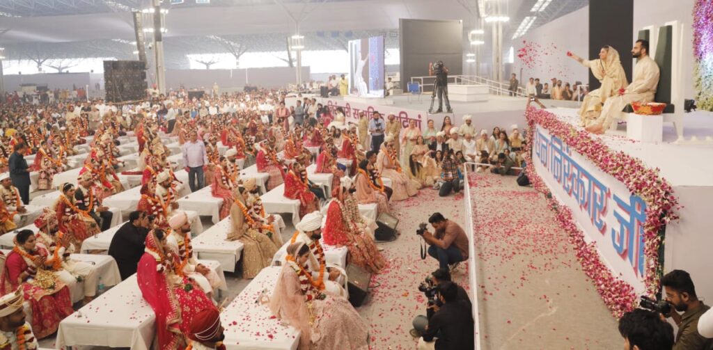 निरंकारी सत्गुरु माता सुदीक्षा जी महाराज एवं निरंकारी राजपिता के परम सान्निध्य में 77 नव विवाहित जोडे़ परिणय सूत्र के पवित्र बंधन में बंधे।सत्गुरु माता ने गृहस्थ जीवन को भक्ति के साथ जीने का आशीर्वाद प्रदान किया।दांपत्य जीवन की शुरुआत करने और सुखमय जीवन जीने के लिए उनके परिवार के सदस्यों को भी शुभकामनाएं दी।संत निरंकारी आध्यात्मिक स्थल,समालखा में बने विशाल पंडाल में हजारों निरंकारी संतों की उपस्थिति में देश एवं विदेश के जोड़े परिणय सूत्र में बंधे।निरंकारी राजपिता के भाई रोहन चांदना का विवाह यूनाइटेड किंगडम से आई पूर्वा साहनी के साथ सादगी पूर्वक इन्हीं सामूहिक शादियों में सम्पन्न हुआ।इस साधारण रीति रिवाज में पारम्परिक जयमाला के साथ निरंकारी विवाह का विशेष चिन्ह सांझा-हार भी प्रत्येक जोडे़ को मिशन के प्रतिनिधियों द्वारा पहनाया गया।लावों के दौरान सत्गुरु माता जी ने वर-वधू पर पुष्प-वर्षा कर अपना दिव्य आशीर्वाद प्रदान किया।उनके साथ साध संगत,वर-वधू के सम्बधित परिजनों ने भी पुष्प-वर्षा की।निश्चित रूप से यह एक आलौकिक दृश्य था।