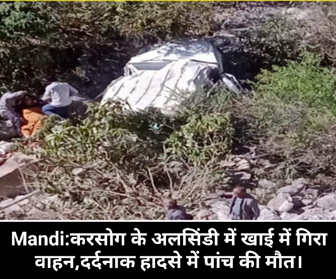 Mandi जिले के करसोग उपमंडल के अलसिंडी में एक दर्दनाक सड़क हादसा पेश आया है,यहां एक वाहन खाई में गिरने से चार महिलाओं और वाहन चालक की मौके पर ही मौत हो गई।वहीं छ:( 6)अन्य गंभीर रूप से घायल हैं।घायलों को उपचार के लिए सुन्नी और आईजीएमसी अस्पताल ले जाया गया है।हादसे का पता चलते ही आस पास के ग्रामीण घटनास्थल पर पहुंचे और राहत व बचाओ कार्यों में जुट गए,कुछ समय बाद पुलिस की टीम भी मौके पर पहुंची और घायलों को अस्पताल पहुंचाया,क्षेत्र में पेशे आए इस हादसे के बाद स्थानीय लोग सदमे में हैं।सभी मृतक महिलाएं महिला मंडल की सदस्य बताई जा रही हैं।महिला मंडल जस्सल की अधिकतर सदस्य थी।वह बलिंडी में कृषि विभाग के शिविर में भाग लेने जा रही थी।उसी दौरान प्रदेश के लोक निर्माण मंत्री विक्रमादित्य सिंह का काफिला करसोग की ओर जा रहा था।विक्रमादित्य सिंह हादसे का पता चलने पर वहां काफिले सहित रुक गए।अलसिंडी गांव मंडी और शिमला जिले की सीमा पर स्थित है।हादसे में जान गवाने वालों में जस्सल निवासी ड्राइवर हरिकृष्ण (45)सुरक्षा देवी (40)लता देवी (40)कौरा देवी (36)और निर्मला देवी (56) की मौके पर ही मौत हो गई,वहीं कमलेश,रीमा देवी,मनोरमा देवी,कृष्णा देवी,सत्या देवी,मीरा देवी और सावत्री देवी घायल हुए हैं,जिन्हें सिविल अस्पताल सुन्नी से प्राथमिक उपचार के बाद शिमला स्थित आईजीएमसी रेफर किया गया है,करसोग प्रशासन ने मृतक के परिवारों को 25 हजार और घायलों को 5 हजार की फौरी राहत जारी की है।