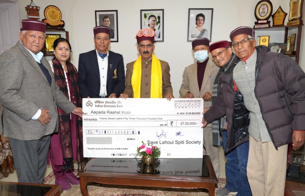लाहौल स्पीति जिले के कर्मचारियों,किसानों,पंचायती राज संस्थाओं,सेवानिवृत्त अधिकारियों तथा अन्य निवासियों ने सेव लाहौल स्पीति स्वयंसेवी सोसाइटी के माध्यम से प्रदेश में प्राकृतिक आपदा से ग्रसित लोगों की सहायता के लिए यहां आपदा राहत कोष के लिए मुख्यमंत्री ठाकुर सुखविंदर सिंह सुक्खू को 29 लाख रुपए के चेक भेंट किये।इसके अतिरिक्त लाहौल स्पीति ज़िले के निवासियों तथा अन्य जिलों के लोगों से 9 लाख रुपए का अंशदान एकत्र कर मुख्यमंत्री राहत कोष में भी जमा किया है।मुख्यमंत्री ने अंशदान के लिए आभार व्यक्त करते हुए कहा कि इस तरह के योगदान संकट की घड़ी में जरूरतमंदों की मदद के लिए महत्वपूर्ण हैं।इस अवसर पर सेव लाहौल स्पीति सोसाइटी के अध्यक्ष तथा पूर्व डीएसपी प्रेम कटोच के साथ संस्था के अन्य सदस्य,केंद्र सरकार के पूर्व वरिष्ठ अधिकारी सुंदर ठाकुर,पूर्व वरिष्ठ बैंक अधिकारी टशी छेरिग,वर्तमान में आईटीबीपी में डीआईजी के पद पर कार्यरत प्रेमसिंह और अन्य व्यक्ति उपस्थित थे।