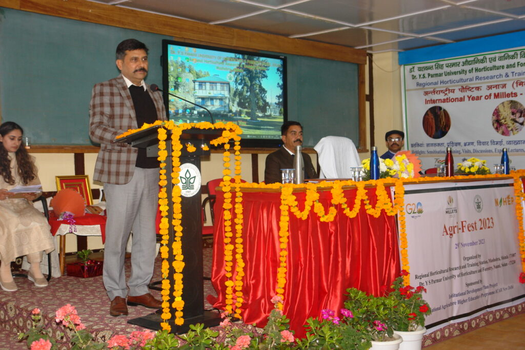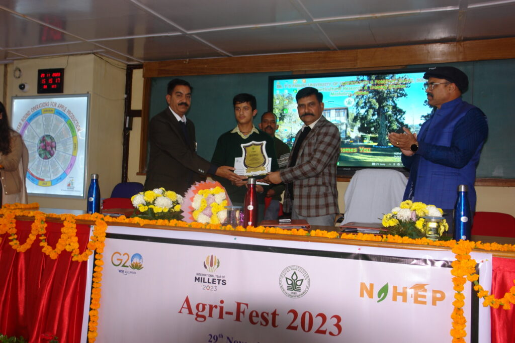 डॉ.यशवन्त सिहं परमार औद्योनिकी एंव वानिकी विश्वविद्यालय के क्षेत्रीय बागवानी अनुसंधान एंव प्रशिक्षण केन्द्र,मशोबरा मे बुधवार को आई.डी.पी. परियोजना के तहत कृषि उत्सव मनाया गया,कार्यक्रम में डॉ.यशवन्त सिहं परमार औद्योनिकी एंव वानिकी विश्वविद्यालय के कुलपति,डॉ.राजेश्वर सिंह चन्देल ने बतौर मुख्यतिथी के रूप में उपस्थित होकर समारोह की शोभा बढ़ाई,इस अवसर पर शिमला जिला के दस स्कूलों के (दसवीं से बारहवी कक्षा के) 125 विद्यार्थियों तथा शिक्षकों ने भाग लिया,कार्यक्रम के दौरान “मेरी माटी मेरा देश” विषय पर पोस्टर मेकिंग प्रतियोगिता भी आयोजित की गई,इस प्रतियोगिता में राजकीय उच्च विद्यालय गड़काहन,के सौरव ने पहला तथा गुम्मा पब्लिक स्कूल की प्रेरणा शर्मा ने दूसरा तथा वरिष्ठ माध्यमिक पाठशाला,क्यारकोटी के आर्यन शाड़िल ने तीसरा स्थान प्राप्त किया,पारितोषिक वितरण समारोह के दौरान मुख्यतिथी,डॉ.राजेश्वर सिंह चन्देल ने विजेताओं को पुरस्कार वितरित किए।