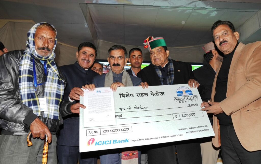 CM ठाकुर सुखविंदर सिंह सुक्खू ने इस वर्ष बरसात के दौरान भारी बारिश,भू-स्खलन तथा बाढ़ से आई आपदा से प्रभावित परिवारों के लिए ‘पुनर्वास’ कार्यक्रम के तहत सोलन के ठोडो ग्रांऊड में आपदा प्रभावित परिवारों को 11.31 करोड़ रुपए से अधिक की राहत राशि प्रदान की,जिनमें 377 परिवारों को मकान पूरी तरह से क्षतिग्रस्त होने पर पहली किश्त के रूप में 3-3 लाख रुपए जारी किए। जिला सोलन के आपदा प्रभावितों को अब तक 42.53 करोड़ रुपए की धनराशि जारी की जा चुकी है।इस अवसर पर मुख्यमंत्री ने कहा कि जिला सोलन में आपदा के कारण 8700 परिवार प्रभावित हुए हैं।उन्होंने कहा कि जिला में 377 घर पूरी तरह से तबाह हुए जबकि लगभग 500 घरों को आंशिक रुप से नुकसान पहुँचा।उन्होंने कहा कि आपदा प्रभावितों के घर के पूरी तरह क्षतिग्रस्त होने पर दिए जाने वाले 1.30 लाख रुपये के मुआवजे को बढ़ाकर सात लाख रुपये किया गया है।इसके अतिरिक्त बिजली-पानी का कनेक्शन राज्य सरकार फ्री प्रदान कर रही है और घर निर्माण के लिए सीमेंट भी सरकारी दरों पर 280 रुपए प्रति बैग की दर से दिया जा रहा है।इसके अलावा कच्चे व पक्के मकान के आंशिक रूप से क्षतिग्रस्त होने पर दिए जाने वाले मुआवजे को बढ़ाकर एक लाख रुपये किया गया है।