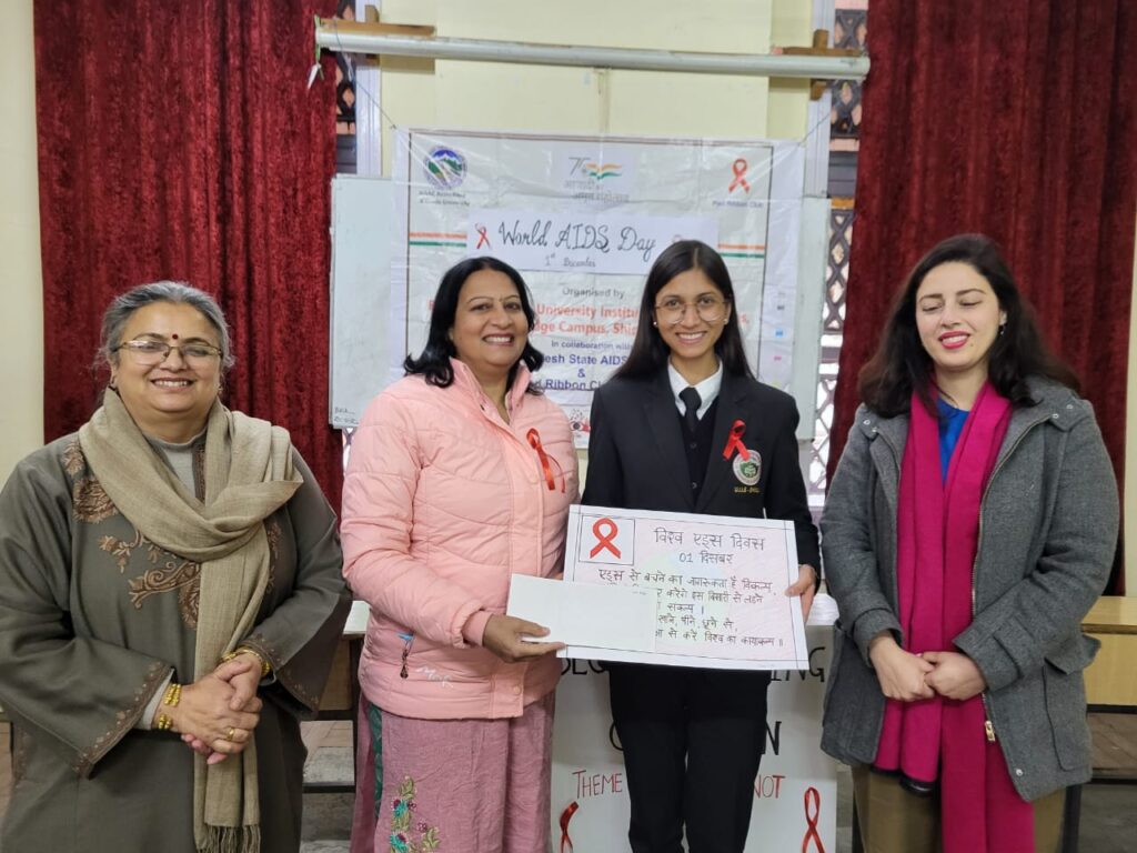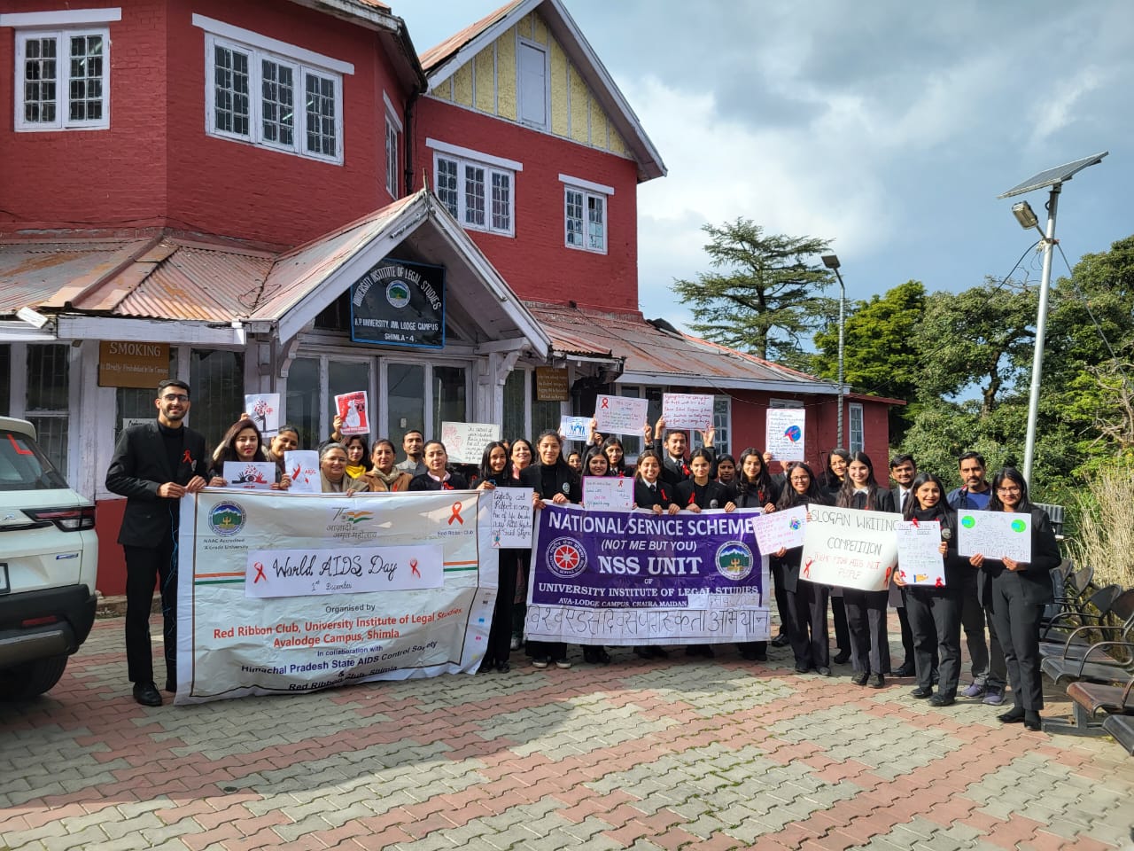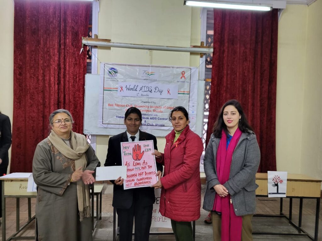 Himachal Pradesh विधिक अध्ययन संस्थान की रेड रिबन एवं एनएसएस इकाई ने अंतर्राष्ट्रीय एड्स दिवस के उपलक्ष्य पर नारा लेखन प्रतियोगिता एव जागरुकता रैली का आयोजन किया।इसमें विश्वविद्यालय के 50 से अधिक छात्रों ने भाग लिया।