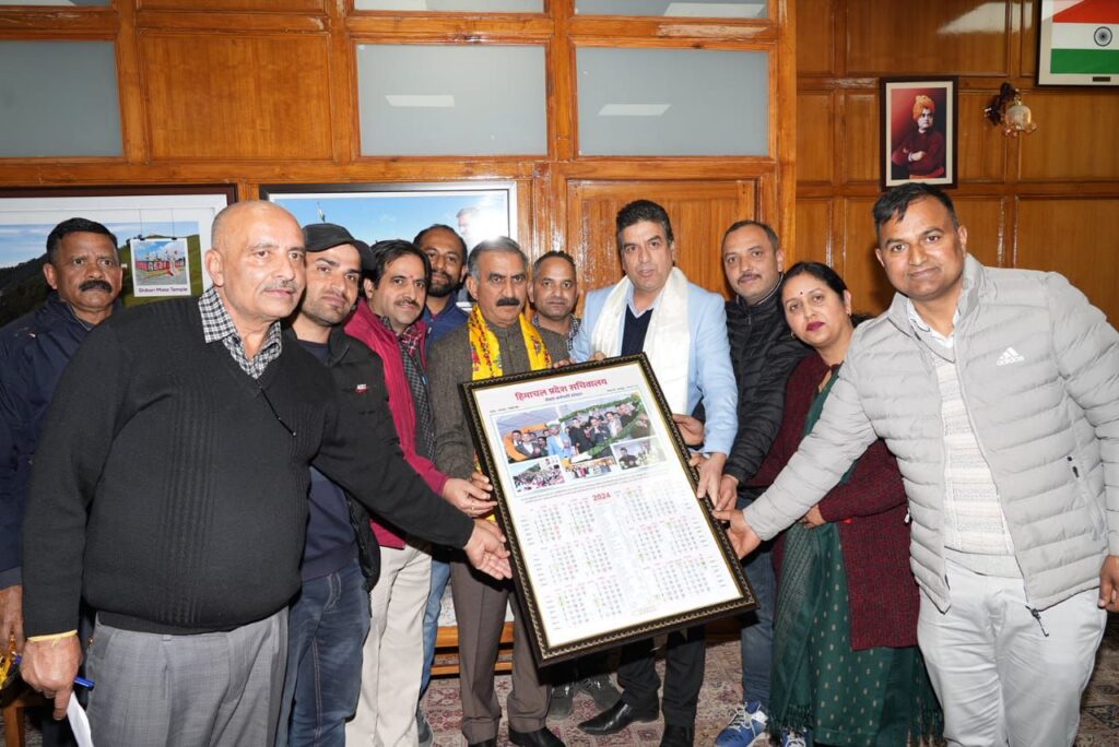 CM ठाकुर सुखविंदर सिंह सुक्खू ने हिमाचल प्रदेश सचिवालय सेवाएं कर्मचारी संगठन के वर्ष 2024 के कैलेंडर का विमोचन किया।संगठन ने पहली बार कैलेंडर जारी किया है।संगठन के अध्यक्ष संजीव शर्मा ने इस अवसर पर मुख्यमंत्री ठाकुर सुखविंदर सुक्खू को सम्मानित भी किया।मुख्यमंत्री के प्रधान सलाहकार (मीडिया) नरेश चौहान,मुख्यमंत्री के प्रधान सचिव भरत खेड़ा,ओएसडी गोपाल शर्मा,संगठन के महासचिव कमल कृष्ण शर्मा,वरिष्ठ उपप्रधान रमन शर्मा,उप प्रधान महेन्द्र सिंह,कोषाध्यक्ष रामपाल शर्मा,कार्यकारिणी सदस्य पुष्पलता,जगमेश सिंह कंवर,सुभाष भारद्वाज,अनिल धांटा तथा विनोद कुमार इस अवसर पर उपस्थित थे।
