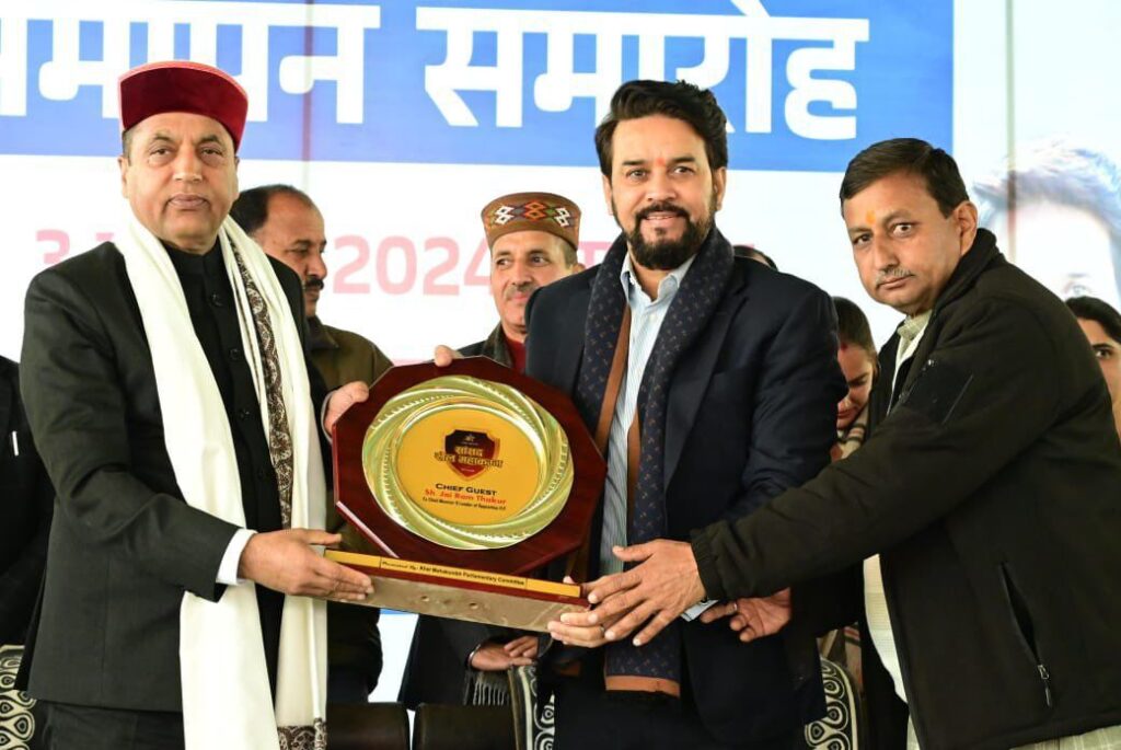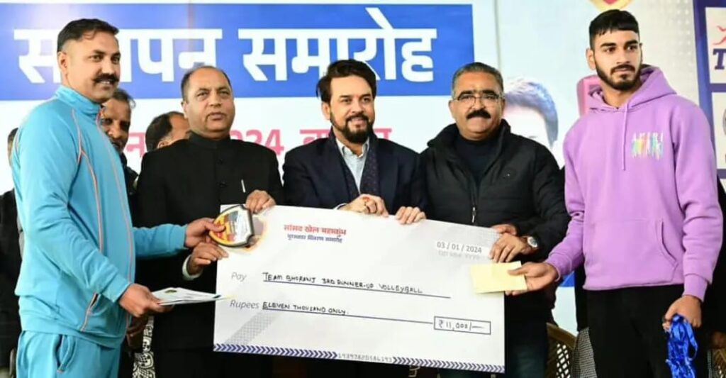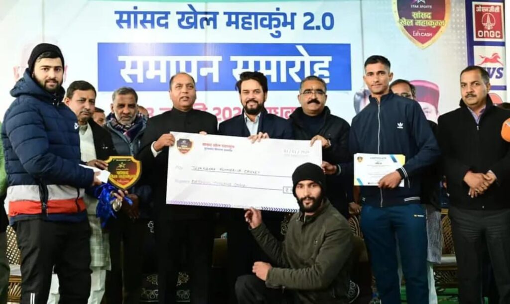 केंद्रीय सूचना एवं प्रसारण, युवा एवं खेल मामलों के मंत्री अनुराग सिंह ठाकुर हमीरपुर संसदीय क्षेत्र के घुमारवीं विधानसभा में सांसद खेल महाकुंभ 2.0 के समापन समारोह में शामिल हुए।इस अवसर पर हिमाचल प्रदेश के पूर्व मुख्यमंत्री व विधानसभा में नेता प्रतिपक्ष जयराम ठाकुर समेत कई गणमान्य भी उपस्थित रहे।सांसद खेल महाकुंभ 2.0 की जानकारी देते हुए अनुराग ठाकुर ने कहा कि “मेरा मानना है कि किसी व्यक्ति के समग्र विकास और राष्ट्रनिर्माण में खेलों की अहम भूमिका है।हमीरपुर संसदीय क्षेत्र और हिमाचल प्रदेश में खेल और खिलाड़ियों को आगे बढ़ाने और उन्हें एक प्लेटफॉर्म उपलब्ध कराने के लिए लगातार मैं प्रयासरत हूँ।हमारे ग्रामीण और पंचायत स्तर पर बहुत सी अनूठी प्रतिभाएँ मौजूद हैं जिन्हें बस ढूँढ कर सामने लाने के लिए एक मंच की ज़रूरत है।इसे ध्यान में रखते हुए मैंने 2018 में हमीरपुर संसदीय क्षेत्र में खेल महाकुंभ की शुरुआत की जोकि बहुत ही सफल रहा।इस बार के खेल महाकुंभ 2.0 में भी खिलाड़ियों ने बढ़चढ़ कर भाग लिया। इस बार खेलों में 49000 से ज्यादा प्रतिभागियों ने 7 से ज्यादा खेल विधाओं में भाग लिया।क्रिकेट में 831,वॉलीबॉल में 539,कबड्डी में 371,बास्केटबॉल में 295,फुटबॉल में 169,रेसलिंग में 800 से ज्यादा और एथलेटिक्स में भी 4000 से ज्यादा प्रतिभागियों ने अपना दमखम दिखाया।मैं खेल महाकुंभ में भाग लेने वाले सभी खिलाड़ियों को अपनी हार्दिक बधाई देता हूँ।अनुराग ठाकुर ने प्राइज मनी की जानकारी देते हुए बताया,”इस बार लगभग 50 लाख प्राइजमनी के तौर पर खिलाड़ियों को प्रोत्साहित करने के उद्देश्य से बांटे गए।कबड्डी,वालीबाल बास्केटबाल और फुटबॉल की सर्वश्रेष्ठ टीमों को ₹51000 प्रति टीम दिए गए। इन्हीं चार खेल विधाओं में दूसरे नंबर की टीमों को ₹31000 प्रति टीम,तीसरे नंबर की टीमों को ₹21000 प्रति टीम और चौथे नंबर की टीमों को ₹11000 रुपए प्रति टीम दिए गए। इसके साथ हीं क्रिकेट की विजेता टीम को एक लाख रुपये, रनर अप को ₹50000,तीसरी टीम को ₹31000 और चौथी टीम को ₹21000 प्रोत्साहन के तौर पर दिए गए।साथ ही साथ खिलाड़ियों को ट्राफ़ी,मेडल व सर्टिफिकेट देकर उन्हें प्रोत्साहित किया गया।