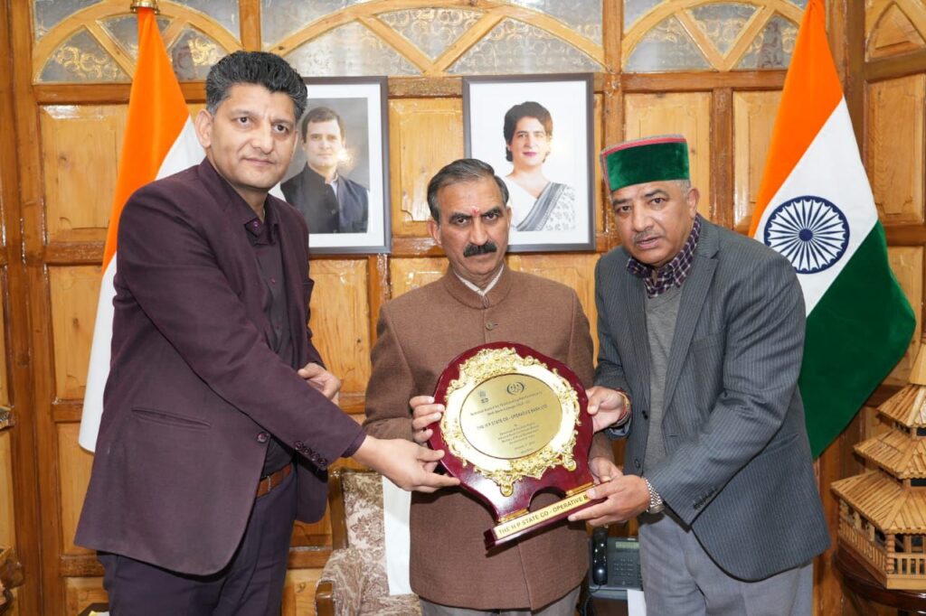 स्वयं सहायता समूह बैंक लिंकेज में उत्कृष्ट प्रदर्शन के लिए हिमाचल प्रदेश राज्य सहकारी बैंक को प्रतिष्ठित राष्ट्रीय पुरस्कार से सम्मानित किया गया है।भारत सरकार के ग्रामीण विकास मंत्रालय द्वारा दीन दयाल अंत्योदय योजना-राष्ट्रीय ग्रामीण आजीविका मिशन के अंतर्गत वर्ष 2022-23 के लिए हिमाचल को यह पुरस्कार हाल ही में नई दिल्ली में प्रदान किया गया।मुख्यमंत्री ठाकुर सुखविंदर सिंह सुक्खू ने इस उपलब्धि के लिए बैंक प्रबंधन के प्रयासों की सराहना की है।ठाकुर सुखविंदर सिंह सुक्खू से हिमाचल प्रदेश राज्य सहकारी बैंक के अध्यक्ष देवेन्द्र श्याम ने भेंट कर उन्हें राष्ट्रीय पुरस्कार के रूप में प्राप्त ट्रॉफी और प्रशस्ति पत्र भेंट किया।मुख्यमंत्री ने बैंक के प्रयासों की सराहना करते हुए कहा कि ग्रामीण स्तर पर उत्कृष्ट कार्य करने के लिए बैंक को भारत में सर्वाेच्च श्रेणी के पुरस्कार से नवाजा जाना बैंक ही नहीं बल्कि पूरे प्रदेश के लिए गौरव का विषय है।उन्होंने कहा कि हिमाचल प्रदेश राज्य सहकारी बैंक ने अपनी कार्यशैली से सहकारी क्षेत्र में एक अलग पहचान बनाई है।इस अवसर पर राज्य सहकारी बैंक के अध्यक्ष देवेन्द्र श्याम ने मुख्यमंत्री को बैंक की विभिन्न योजनाओं से अवगत करवाया।बैंक के प्रबंध निदेशक श्रवण मान्टा भी इस अवसर पर उपस्थित थे।