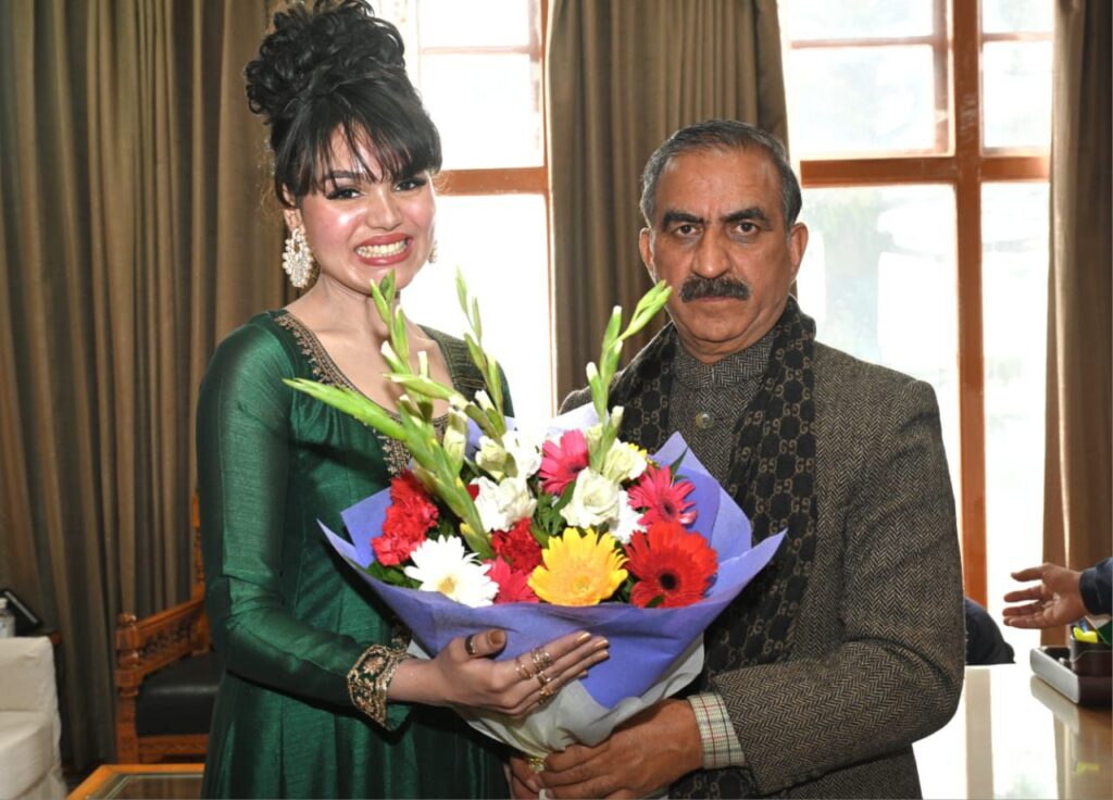 मिस अर्थ इंडिया-2022 वंशिका परमार ने मुख्यमंत्री ठाकुर सुखविंदर सिंह सुक्खू से भेंट की।हमीरपुर जिला के नादौन उपमण्डल के धनेटा गांव से सम्बंध रखने वाली वंशिका ने 19 वर्ष की आयु में नवम्बर,2022 में फिलीपीन्स में आयोजित प्रतियोगिता में यह खिताब हासिल किया था।मुख्यमंत्री ने कहा कि वंशिका की इस उपलब्धि से अन्य लड़कियों को भी अपनी पसंद के क्षेत्र में उत्कृष्ट प्रदर्शन करने की प्रेरणा मिली है।उन्होंने कहा कि यह खुशी की बात है कि प्रदेश की बेटियां विभिन्न क्षेत्रों में अपनी उपलब्धियों से हिमाचल का नाम रोशन कर रही हैं।उन्होंने वंशिका से महिला सशक्तिकरण में प्रदेश सरकार के प्रयासों को संबल प्रदान करने तथा एकल बेटियों के कल्याण के लिए सहयोग करने का आग्रह किया।वंशिका परमार ने प्रदेश में पर्यटन क्षेत्र को बढ़ावा देने में अपना सहयोग प्रदान करने की भी इच्छा जताई।उन्होंने अवगत करवाया कि वह वर्ष-2023 में घाना की पर्यटन दूत रह चुकी हैं और फिलीपीन्स में भी पर्यटन गतिविधियों को बढ़ावा देने के अभियान से जुड़ी रही हैं।इस अवसर पर वंशिका परमार की माता रितु परमार तथा पिता ग्रुप कैप्टन सुशील कुमार परमार भी उपस्थित थे।