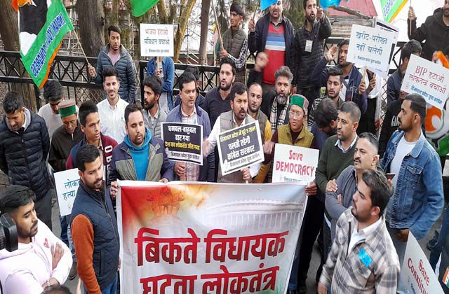 युवा कांग्रेस ने शिमला में केंद्र सरकार और भाजपा का दामन थामने वाले 6 बागी नेताओं के खिलाफ प्रर्दशन का आयोजन किया।प्रदेशाध्यक्ष निगम भंडारी के नेतृत्व में पार्टी मुख्यालय राजीव भवन से लेकर जिला उपायुक्त कार्यालय एक विरोध रैली भी निकाली गई।इस दौरान युकां और एनएसयूआई कार्यकर्त्ताओं ने केंद्र और बागी नेताओं के खिलाफ नारेबाजी भी की।उपायुक्त कार्यालय के बाहर प्रर्दशन में शामिल पदाधिकारियों व कार्यकर्त्ताओं को संबोधित करते हुए निगम भंडारी ने कहा कि हिमाचल की चुनी हुई सरकार को जिस अलोकतांत्रिक ढंग से केंद्र की भाजपा सरकार अस्थिर करने का प्रयास कर रही है,वह निंदनीय है।निगम भंडारी ने कहा कि केंद्र सरकार अपने इस घिनौने खेल के तहत कांग्रेस के 6 विधायकों को पहले हरियाणा फिर उत्तराखंड और दिल्ली ले गई।कहीं न कहीं उन पर दबाव बनाया गया और आज दिल्ली भाजपा मुख्यालय में उन्होंने भारतीय जनता पार्टी का दामन थाम लिया।इसका कांग्रेस,युवा कांग्रेस और एनएसयूआई कड़ा विरोध करती हैं। उन्होंने कहा कि केंद्र की भाजपा सरकार ने सुनियोजित तरीके से कांग्रेस के बागी नेताओं को अपनी पार्टी में शामिल करवाया,जो लोकतंत्र की हत्या है।भंडारी ने कहा कि जनता सब देख रही है और स्वयं लोकसभा चुनाव और विधानसभा उपचुनाव में भाजपा और बागियों को सबक सिखाएगी।इस मौके पर बड़ी संख्या में पदाधिकारी व कार्यकर्त्ता मौजूद रहे।