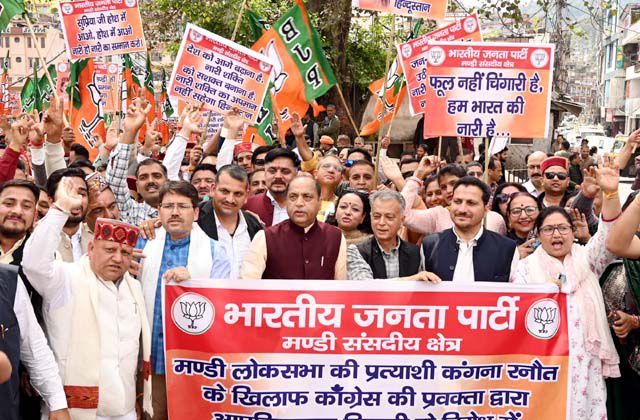 अभिनेत्री एवं मंडी संसदीय सीट से भाजपा की प्रत्याशी कंगना रणौत के खिलाफ कांग्रेस नेत्री सुप्रिया श्रीनेत के सोशल मीडिया हैंडल से की गई अभद्र टिप्पणी को लेकर भाजपा ने मंडी जिला मुख्यालय पर कांग्रेस के खिलाफ प्रदर्शन किया और रैली निकाली।सेरी मंच पर जनसभा को संबोधित करते हुए नेता प्रतिपक्ष एवं पूर्व सीएम जयराम ठाकुर ने कहा कि महिलाओं का अपमान करने वाली कांग्रेस पार्टी ने एक बार फिर से यह साबित कर दिया है कि वे कभी नारी शक्ति का सम्मान नहीं कर सकते।आज कंगना रनौत ने अभिनय के क्षेत्र में कामयाबी के झंडे गाड़ने के बाद जब राजनीति में कदम रखा तो कांग्रेसियों में बौखलाहट पैदा हो गई है।प्रदर्शन के दौरान मंडी संसदीय क्षेत्र के प्रभारी एवं पूर्व मंत्री गोविंद सिंह ठाकुर,भाजपा प्रत्याशी कंगना रणौत के पिता अमरदीप सिंह रणौत,भाजपा के सभी विधायक अनिल शर्मा,राकेश जम्वाल,विनोद कुमार,दलीप कुमार और जिलाध्यक्ष मंडी निहाल चंद शर्मा उपस्थित रहे।जयराम ने कहा कि यह वही कांग्रेस है जिनके रहते प्रदेश में गुड़िया हत्याकांड हो गया और वे कुछ नहीं कर पाए।इसके अलावा नैना साहनी का कांड भी इसी कांग्रेस के शासन में हुआ है। मंडी की बेटी का जिस तरह से अपमान करने की कोशिश की गई है उसे किसी भी लिहाज से बर्दाश्त नहीं किया जाएगा।जयराम ने कहा कि आज कांग्रेस नेत्री यह कह रही हैं कि उनके सोशल मीडिया अकाऊंट का एक्ससैस बहुत से लोगों के पास है लेकिन यदि ऐसा है तो जिसने यह पोस्ट डाली उसके खिलाफ अभी तक कोई कार्रवाई क्यों नहीं की गई है।