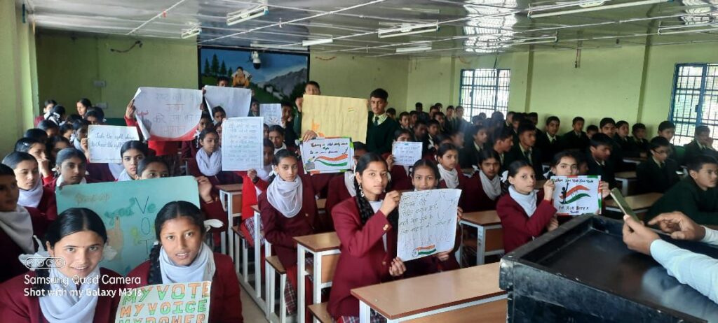 विधानसभा 63-शिमला शहरी में “सुव्यवस्थित मतदाता शिक्षण एवं निर्वाचक सहभागिता” (स्वीप) कार्यक्रम के अंतर्गत राजकीय वरिष्ठ माध्यमिक विद्यालय संजौली, शिमला में मतदाता जागरूकता अभियान चलाया गया, जिसमें विद्यालय के समस्त विद्यार्थियों, प्रवक्ताओं एवं अध्यापकों ने भाग लिया।इस अवसर पर निर्वाचक साक्षरता क्लब व नोडल अधिकारी द्वारा 85 वर्ष से अधिक वरिष्ठ नागरिकों व दिव्यांग जनों के लिए घर पर ही मतदान करने की व्यवस्था के बारे में विद्यार्थियों के मध्य जानकारी दी गई। साथ ही सर्विस वोटर,एन.आर.आई.वोटर,बैलट पेपर वोट से जुड़ी जानकारी भी बच्चों के मध्य सांझा की गई जिससे घर-घर तक चुनाव आयोग का संदेश पहुंच सके।63-शिमला शहरी निर्वाचन क्षेत्र के लिए नियुक्त नोडल अधिकारी डॉ०सुरेश कुमार ने निर्वाचन साक्षरता क्लब के सदस्यों व विद्यार्थियों को कार्यक्रम की आवश्यकता और महत्व के विषय में विस्तृत जानकारी दी।प्रत्येक पात्र युवा मतदाता को सूची में सम्मिलित करने के साथ-साथ लोकतंत्र की मजबूती के लिए जन-जन की भागीदारी सुनिश्चित करना ही कार्यक्रम का ध्येय है।