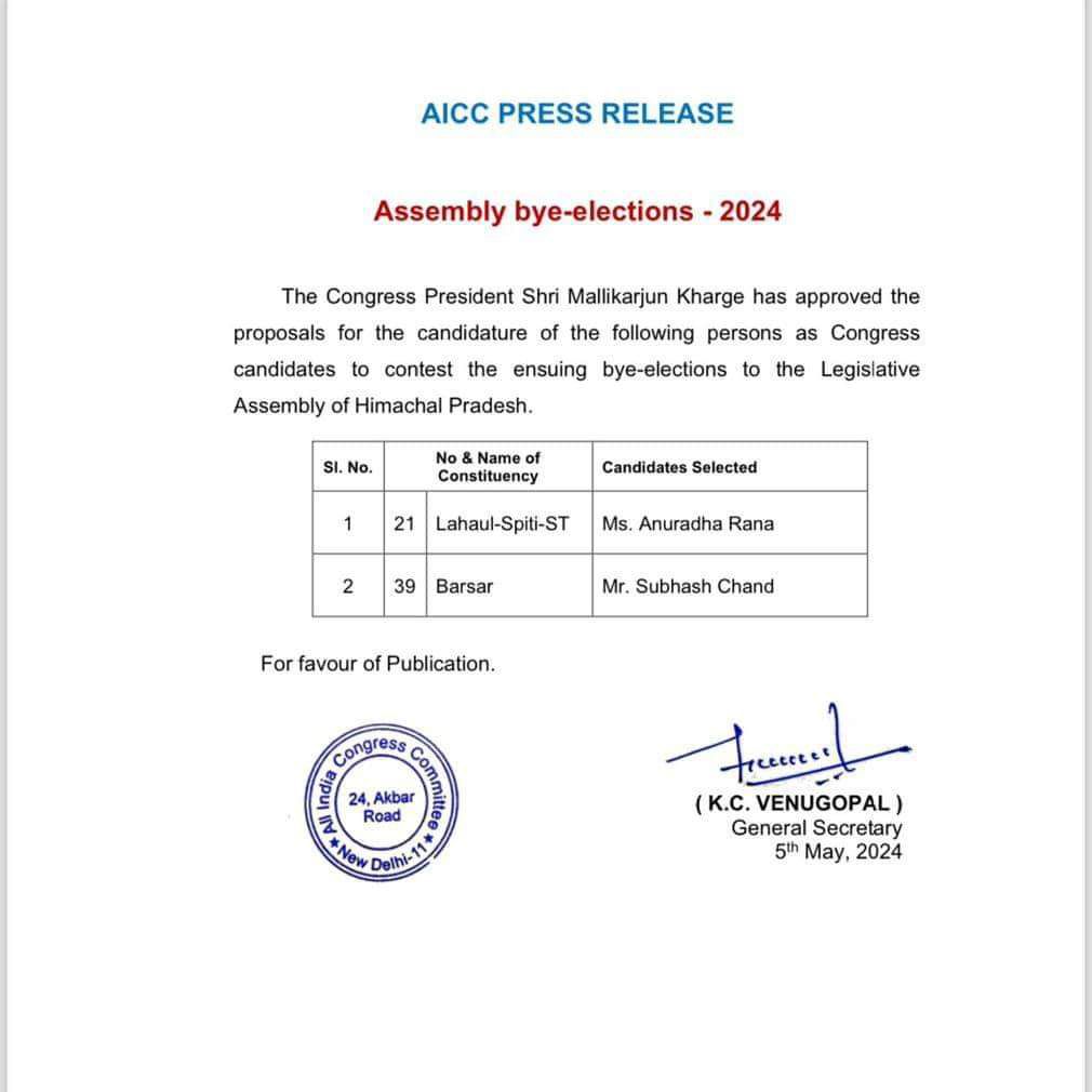 कांग्रेस पार्टी ने रविवार को हिमाचल में उपचुनाव के लिए पार्टी के उम्मीदवारों को घोषित कर दिया है,कांग्रेस ने बड़सर विधानसभा सीट से सुभाष चंद को और लाहौल-स्पीति से अनुराधा राणा को उम्मीदवार बनाया है,कांग्रेस अध्यक्ष मल्लिकार्जुन खड़गे ने इन नामों को मंज़ूरी दे दी है ।