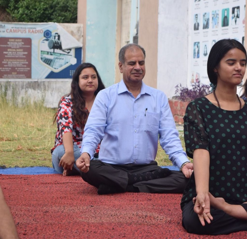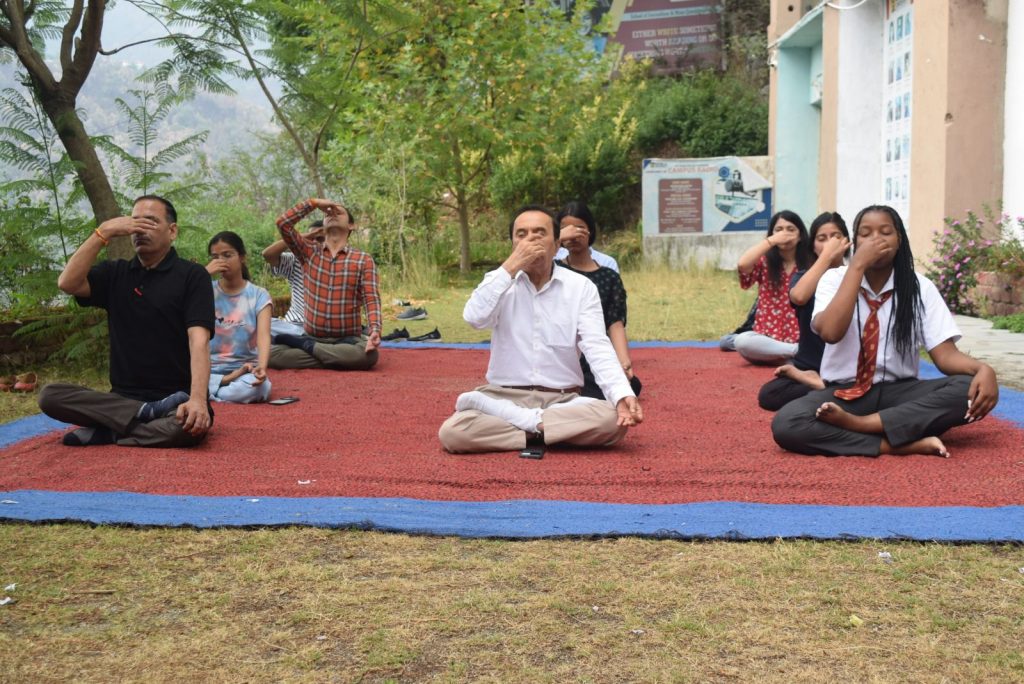 देश-दुनिया में शुक्रवार को योग दिवस मनाया।एपीजी शिमला विश्वविद्यालय में भी शिक्षकों और विद्यार्थियों ने एक साथ योग किया।एपीजी शिमला विश्वविद्यालय के प्रो-चांसलर प्रो.डॉ.रमेश चौहान ने भी योग कार्यक्रम में हिस्सा लिया।योग कार्यक्रम एपीजी शिमला विश्वविद्यालय के परिसर में आयोजित किया गया।