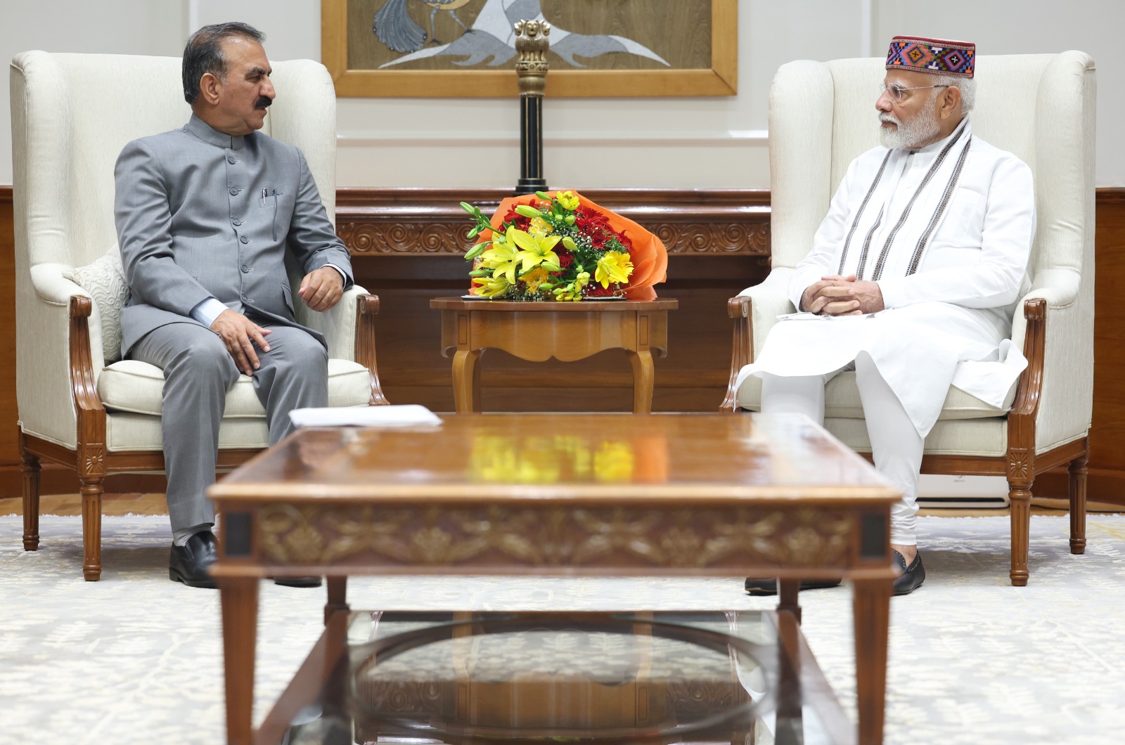 मुख्यमंत्री ठाकुर सुखविंद्र सिंह सुक्खू ने नई दिल्ली में प्रधानमंत्री नरेंद्र मोदी से भेंट की।उन्होंने प्रधानमंत्री से हिमाचल प्रदेश को हरित ऊर्जा संपन्न राज्य बनाने के लिए समर्थन मांगा।उन्होंने इस लक्ष्य को हासिल करने के लिए राज्य सरकार द्वारा किए जा रहे प्रयासों से भी प्रधानमंत्री को अवगत करवाया।उन्होंने कहा कि ताप विद्युत खरीद की शर्ताें एवं नियमों में राहत देते हुए राज्य को उचित मुआवजा प्रदान किया जाए क्योंकि प्रदेश जल्द ही हरित ऊर्जा निर्भर राज्य बनने जा रहा है।उन्होंने कहा कि हरित ऊर्जा की दिशा में कदम बढ़ाते हुए राज्य में इलेक्ट्रिक बसों को बढ़ावा दिया जा रहा है।मुख्यमंत्री ने ई-बसों की फंडिंग के लिए नाबार्ड के तहत ग्रामीण आधारभूत संरचना विकास निधि (आरआईडीएफ) ऋण प्रदान करने की अनुमति देने का आग्रह किया।उन्होंने कहा कि स्पीति में 1000 मेगावॉट हाइब्रिड सौर और पवन ऊर्जा उत्पादन की क्षमता है जिसका ग्रीन कॉरिडोर ट्रांसमिशन के जरिए दोहन किया जा सकता है।उन्होंने कहा कि सतलुज घाटी मे सौर,पवन और जलविद्युत ऊर्जा की अपार संभावनाएं हैं।उन्होंने प्रधानमंत्री को केंद्र सरकार के पास लंबित बिजली परियोजनाओं से संबंधित मुद्दों को भी उठाया।उन्होंने कहा कि बार-बार आग्रह करने के बावजूद भाखड़ा ब्यास प्रबंधन बोर्ड ने काफी समय से लंबित एरियर का हिमाचल प्रदेश को भुगतान नहीं किया है।इसके अलावा शानन पावर प्रोजेक्ट की पट्टा अवधि पूरी होने के बावजूद प्रदेश को अभी तक इसका मालिकाना हक नहीं मिल पाया है।उन्होंने एसजेवीएन और एनएचपीसी की बिजली परियोजनाओं को दी जा रही निशुल्क पावर रॉयल्टी का मुद्दा भी प्रमुखता से उठाया और इस संबंध में अनुकूल निर्णय लेने का आग्रह किया।मुख्यमंत्री ठाकुर सुखविंद्र सिंह सुक्खू ने प्रधानमंत्री को राज्य सरकार द्वारा प्रदेश में पर्यटन को प्रोत्साहित करने के लिए किए जा रहे विशेष प्रयासों की भी जानकारी दी।उन्होंने कहा कि कांगड़ा को पर्यटन राजधानी के तौर पर विकसित किया जा रहा है,वहीं कांगड़ा हवाई अड्डे के विस्तार की प्रक्रिया भी जारी है।उन्होंने केंद्र सरकार से भूमि अधिग्रहण का पचास फीसदी खर्च उठाने और हवाई अड्डे के विस्तारीकरण के लिए विशेष अनुदान देने का भी आग्रह किया।उन्होंने पर्यटन,रोजगार और आर्थिक विकास के लिए पर्यटन विशेष आर्थिक क्षेत्र के लिए नीति बनाने का सुझाव दिया।मुख्यमंत्री ने कहा हिमाचल जैसे पहाड़ी राज्य से इस तरह की नीति को शुरू करना बहुत लाभदायक होगा।उन्होंने प्रधानमंत्री नरेंद्र मोदी को विभिन्न विकासात्मक गतिविधियों के बारे में भी अवगत करवाया और उदार वित्तीय सहायता प्रदान करने का आग्रह किया ताकि राज्य सरकार बीते वर्ष म