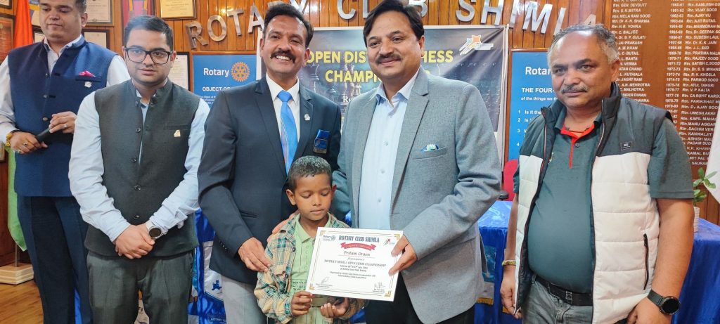 उन्होंने क्लब को प्रतियोगिता के सफल आयोजन पर बधाई दी।उन्होंने क्लब के सदस्यों से आग्रह कि भविष्य में होने वाली खेल प्रतियोगिताओं में चिल्ड्रन ऑफ द स्टेट को भी मंच उपलब्ध करवाने के प्रयास करें।उन्होंने कहा क्लब जिस तरह बायो डिग्रेडेबल वस्तुओं का इस्तेमाल करने पर जोर दे रहा है,वह प्रशंसनीय है।जिला प्रशासन ने मंदिरों में हरी पत्तल का इस्तेमाल की प्रथा आरंभ कर दी है।उन्होंने लोगों से अपील कि अपनी संस्कृति को पीढ़ी दर पीढ़ी आगे बढ़ाएं और विलुप्त हो रही चीजों को पुनर्जीवित करें।रोटरी क्लब शिमला के अध्यक्ष सौरभ राज सूद ने कहा कि रोटरी क्लब की इस पहल का उद्देश्य रणनीतिक सोच,मानसिक अनुशासन और खेल कौशल की भावना को बढ़ावा देना है।इसके साथ ही शिमला जिला के सभी उम्र और कौशल स्तरों के शतरंज प्रेमियों को एक साथ लाना है।समारोह में मुख्यातिथि को टोपी,एक पौधा और स्मृति चिन्ह देकर सम्मानित किया गया।इसके अलावा अन्य अतिथियों को भी सम्मानित किया गया।