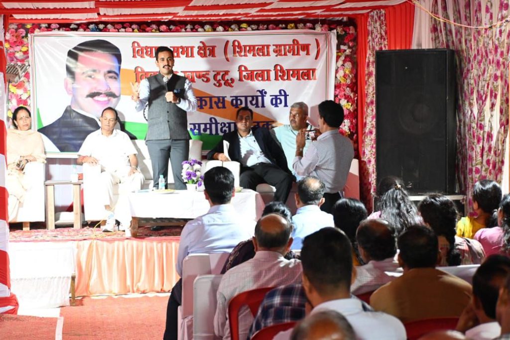 प्रदेश के लोक निर्माण एवं शहरी विकास मंत्री विक्रमादित्य सिंह की अध्यक्षता मे शिमला ग्रामीण विधानसभा क्षेत्र अंतर्गत टुटू ब्लॉक की सभी 34 पंचायतों के प्रधान, उपप्रधान,पंचायत समिति सदस्यों तथा जिला परिषद सदस्यों के साथ पंचायत क्षेत्र के विकास कार्यों विशेषकर लंबित कार्यों से संबंध में समीक्षा बैठक आयोजित की गई।इस अवसर पर बैठक मे उपस्थित पंचायत प्रतिनिधियों को संबोधित करते हुए उन्होंने कहा कि वर्तमान सरकार प्रदेशभर की सभी पंचायतों के सुदृढ़ीकरण एवं पंचायती राज संस्थाओं में महिलाओं की अधिक से अधिक भागीदारी सुनिश्चित करने पर बल दे रही है ताकि महिला सशक्तिकरण के साथ-साथ पंचायत क्षेत्र का समान विकास संभव हो सके।उन्होंने कहा कि अभी तक मनरेगा के अतिरिक्त अन्य मद्दों में टूटू ब्लॉक की पंचायतों की लगभग 5 करोड़ 80 लाख रुपये की राशि खंड विकास कार्यालय में लंबित पड़ी है जिसे निर्धारित समय अवधि के भीतर खर्च किया जाना आवश्यक है।