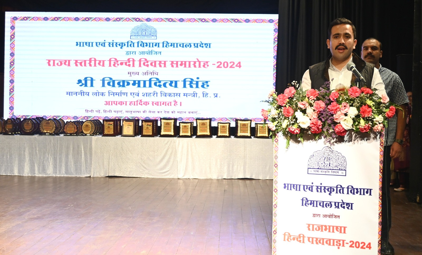 लोक निर्माण एवं शहरी विकास मंत्री विक्रमादित्य सिंह ने कहा कि हम सभी को हिन्दी भाषा पर गर्व होना चाहिए,उन्होंने कहा कि आज हिन्दी भाषा को विश्व भर में अलग पहचान मिली है और भारत देश आज विश्व भर में एक सशक्त देश के रूप में जाना जाता है,विक्रमादित्य सिंह यहाँ ऐतिहासिक गेयटी थिएटर में भाषा एवं संस्कृति विभाग द्वारा आयोजित राज्य स्तरीय हिन्दी दिवस समारोह में उपस्थित जनसमूह को संबोधित कर रहे थे,उन्होंने कहा कि अब समय आ गया है कि हम लोग अंग्रेज़ी भाषा से बाहर निकलें और हिन्दी भाषा का अधिक से अधिक प्रयोग करें। उन्होंने कहा कि प्रधानमंत्री भी विभिन्न देशों में अपनी मातृभाषा का प्रयोग अपने संबोधन में करते हैं जिससे हमारे देश को एक अलग पहचान मिली है,उन्होंने कहा कि जी-20 समिट का आयोजन दिल्ली में किया गया जिसमें विभिन्न देशों ने भाग लिया और हमारे देश को एक सशक्त देश के रूप में पहचान मिली है,उन्होंने कहा कि हिमाचल प्रदेश का निर्माण स्वर्गीय डॉ यशवंत सिंह परमार के प्रयासों से हुआ और तब से लेकर आज तक हिमाचल प्रदेश ने देश और विदेशों में अपनी अलग पहचान बनाई है,इस उपलब्धि में प्रदेश के सभी मुख्यमंत्रियों ने अपना योगदान दिया है।