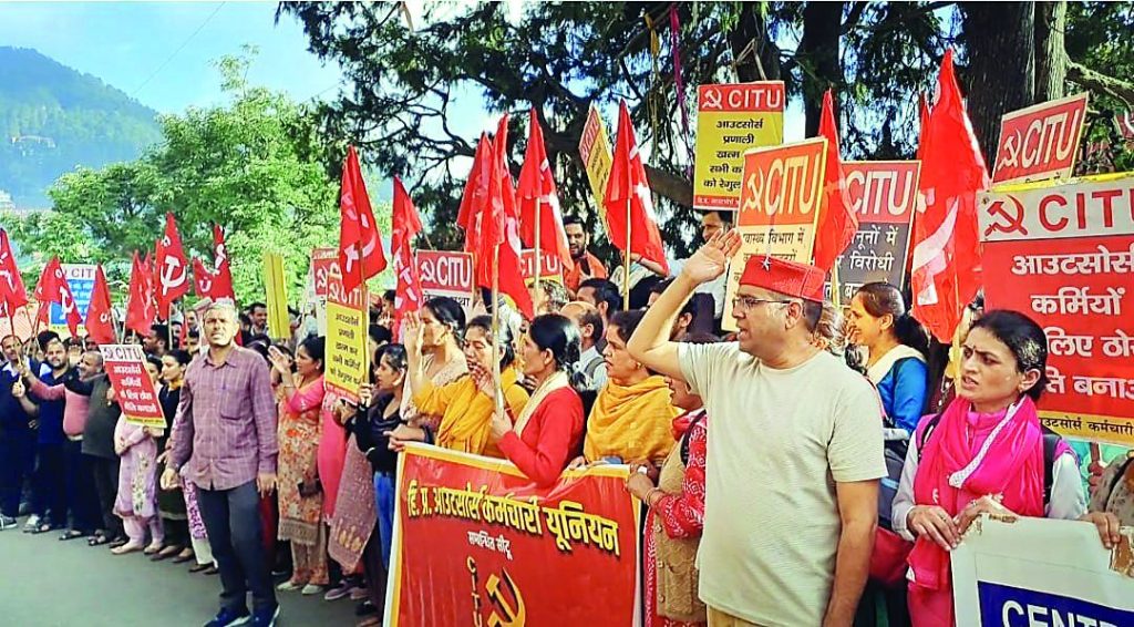 आउटसोर्स कर्मचारियों को नियमित करने की मांग को लेकर श्रमिक संगठन सीटू के साथ कर्मचारियों ने उपायुक्त कार्यालय के बाहर धरना-प्रदर्शन किया,शिमला के डीसी ऑफिस के बाहर हुए प्रदर्शन में विजेंद्र मेहरा,रमाकांत मिश्रा,बालक राम,विनोद बिरसांटा,सहित आईजीएमसी,कमला नेहरू,अटल इंस्टीच्यूट चमियाणा,मेंटल रिहैबिलिटेशन सेंटर अस्पतालों,छह सीवरेज ट्रीटमेंट प्लांटों,सैहब,विशाल मेगामार्ट,बॉर्डर रोड ऑर्गेनाइजेशन से संबंधित ठेका,कैजुअल व आउटसोर्स कर्मियों सहित होटल,तहबाजारी से जुड़े मजदूरों ने भारी संख्या में भाग लिया।सीटू प्रदेशाध्यक्ष विजेंद्र मेहरा और महासचिव प्रेम गौतम ने कहा कि सार्वजनिक क्षेत्र के उद्योगों व प्रतिष्ठानों,निजी तथा सरकारी सेवाओं में कार्यरत ठेका,आउटसोर्स,कैजुअल,मल्टीटास्क, मल्टीपर्पज व फिक्स टर्म मजदूरों को आमतौर पर समान और एक जैसा काम करने के बावजूद नियमित मजदूरों से बहुत कम वेतन दिया जाता है,उन्हें कानूनी रूप से मिलने वाली सामाजिक सुरक्षा व आय लाभों से वंचित रखा जाता है।