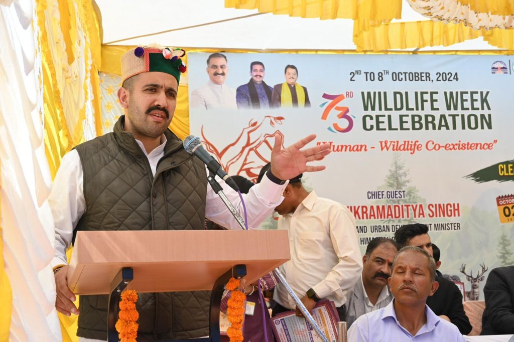 राज्य स्तरीय 73वें वन्य प्राणी सप्ताह का शुभारंभ बुधवार को शिमला के पोटर हिल में आयोजित विशेष कार्यक्रम से किया गया।इस कार्यक्रम में लोक निर्माण एवं शहरी विकास मंत्री विक्रमादित्य सिंह ने बतौर मुख्यातिथि शिरकत की।इस कार्यक्रम की थीम ह्यूमन वाइल्डलाइफ को-एक्सिस्टेंस थी।कार्यक्रम को संबोधित करते हुए मुख्यातिथि ने राष्ट्रपिता महात्मा गांधी और लाल बहादुर शास्त्री की जयंती पर सभी को शुभकामनाएं देते हुए कहा कि आज की युवा पीढ़ी को इनके पद चिन्हों पर चलते हुए अपने लक्ष्य हासिल करना चाहिए।उन्होंने कहा कि राष्ट्रपिता ग्रामोद्योग को लेकर हमेशा एक मार्गदर्शक के तौर पर जाने जाते है।उन्होंने कहा था कि असली भारत गांव में बसता है।ऐसे में अगर गांव में विकास होगा तो सम्पूर्ण असली भारत का विकास होगा।ग्रामीण विकास पंचायतों के माध्यम से हो रहा है।अब तो पंचायती राज प्रणाली में महिलाओं की सहभागिता भी बढ़ रही है। उन्होंने कहा कि वन्य जीव प्राणी सप्ताह और स्वच्छता अभियान के संयुक्त रूप एक जन आंदोलन के तौर पर आगे बढ़ना चाहिए।