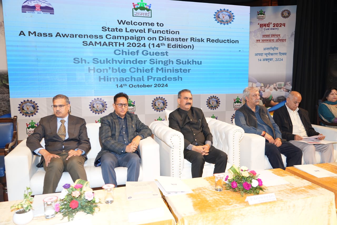 मुख्यमंत्री ठाकुर सुखविंद्र सिंह सुक्खू ने अंतरराष्ट्रीय आपदा न्यूनीकरण दिवस ‘समर्थ-2024’ की अध्यक्षता करते हुए कहा कि आपदा के प्रभावी प्रबन्धन में जागरूकता महत्त्वपूर्ण भूमिका अदा करती है,जिससे जान-माल की क्षति को कम किया जा सकता है।उन्होंने कहा कि जलवायु परिवर्तन के कारण आपदा की घटनाओं में वृद्धि हुई है। इसलिए आपदाओं का बेहतर प्रबन्धन सुनिश्चित कर हमें इन चुनौतियों के साथ जीना सीखना होगा।उन्होंने कहा कि राज्य सरकार पर्याप्त धनराशि व्यय कर लोगों को आपदा से निपटने की तैयारियों के बारे में जागरूक कर रही है और आपदा से प्रभावी तरीके से निपटने के लिए कई उपाय अपनाए जा रहे हैं।आपदा की चुनौतियों का सामना करने के लिए प्राधिकरण को सदैव तैयार रहना चाहिए।इस दिशा में फ्रांस की एजेंसी एएफडी के सहयोग से 800 करोड़ रुपये की परियोजना का क्रियान्वयन किया जा रहा है और मिटीगेशन फंड से 500 करोड़ रुपये व्यय किए जा रहे हैं।मुख्यमंत्री ने पालमपुर में एक मुख्य एसडीआरएफ प्रशिक्षण संस्थान स्थापित करने की घोषणा भी की।राज्य सरकार प्रदेश में बेहतर मौसम पूर्वानुमान के लिए बुनियादी अधोसंरचना को भी सुदृढ़ कर रही है।