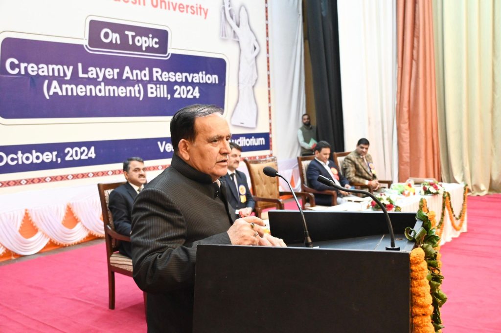 उन्होंने कहा कि इस युवा संसद में क्रीमीलेयर और आरक्षण संशोधन विधेयक-2024 पर विद्यार्थी विस्तृत तरीके से विचार रखेंगे।यहां के अध्यक्ष और उपाध्यक्ष इस संसद की कार्यवाही को करेंगे।समाज के हित में किन नीतियों,योजनाओं,संशोधनों की आवश्यकता है,इन विषयों पर गहन चर्चा होनी चाहिए।उन्होंने कहा कि तकनीक के आधार पर पूर्ण रूप निर्भर न रहते हुए विद्यार्थियों को अपना बौद्धिक ज्ञान का इस्तेमाल करना चाहिए।उन्होंने कहा मैं अपने विधानसभा क्षेत्र में सभी को विकास के एक समान अवसर मुहैया करवाता हूं।वहां के लोगों की समस्याओं का प्राथमिकता के हिसाब से निराकरण किया जाता है।उन्होंने कहा कि हिमाचल प्रदेश विश्वविद्यालय ने प्रदेश के विकास में अभूतपूर्व योगदान दिया है।यहां से पढ़े बच्चे देश दुनिया प्रदेश में अपनी सेवाएं दे रहें है।युवा संसद में बतौर मुख्यावक्ता शिरकत करते हुए डॉ देवेंद्र सिंह ने कहा कि देश में क्रीमी लेयर एंड रिजर्वेशन (अमेंडमेंट) बिल 2024 पर चर्चा चली हुई है।इसके पक्ष और विपक्ष को लेकर अनेकों तक वितर्क है।कानून समय के मुताबिक परिवर्तित होते है।लेकिन हर कानून का लक्ष्य समाज में बदलाव लाना और एक समान विकास करना है।देश के संविधान ने समाज में बदलाव लाने में बेहतरीन और अग्रणी भूमिका निभाई है।उन्होंने कहा जो भेदभाव दशकों से जाति आधारित होता था।उसमें अब काफी हद तक रोक लग गई है।आज सामाजिक क्षेत्र में अनुसूचित जाति और जनजाति से संबंध रखने वालों को अवसरों की समानता मिल रही है।इस युवा संसद में उक्त बिल को लेकर एक स्वस्थ चर्चा होगी और युवा पीढ़ी ही देश में बदलाव लाने में महत्वपूर्ण भूमिका निभा सकती है।मुख्यातिथि विधानसभा अध्यक्ष कुलदीप पठानिया को प्रति कुलपति प्रो राजेंद्र वर्मा ने शॉल,टॉपी और स्मृति चिन्ह देकर सम्मानित किया।इसके अलावा विशिष्ट अतिथि और मुख्य वक्ता को भी सम्मानित किया गया।