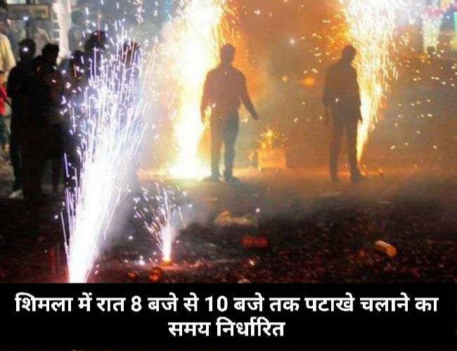 उपायुक्त शिमला अनुपम कश्यप ने आदेश जारी करते हुए बताया कि दिवाली त्योहार के दौरान पटाखे चलाने और उपयोग करने का समय शाम 8 बजे से 10 बजे तक होगा। इस दौरान केवल हरित पटाखों के उपयोग की ही अनुमति होगी।उन्होंने बताया कि जिन शहरों व कस्बों में वायु की गुणवत्ता मध्यम या उससे नीचे है,वहां केवल ग्रीन पटाखे बेचे जाएं और दिवाली,छठ,नए साल व क्रिसमस की पूर्व संध्या आदि जैसे त्योहारों के दौरान पटाखे चलाने और इस्तेमाल करने का समय दो घंटे तक सीमित रखा गया है।यह निर्देश (2019) 13 एससीसी 523 में सर्वोच्च न्यायालय के निर्देश के आधार पर है।