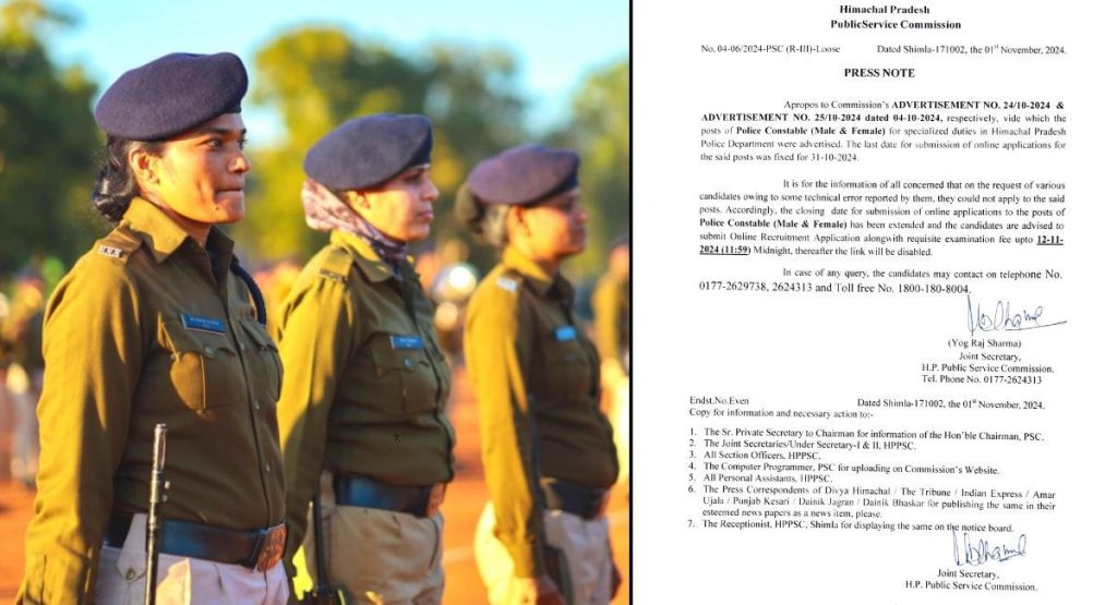हिमाचल प्रदेश सरकार के एक प्रवक्ता ने बताया कि मुख्यमंत्री ठाकुर सुखविंद्र सिंह सुक्खू के निर्देश पर आयोग द्वारा की जा रही पुलिस भर्ती की आवेदन तिथि 31 अक्तूबर से बढ़ाकर 12 नवम्बर,2024 की गई है।मुख्यमंत्री ने यह फैसला पुलिस भर्ती में युवाओं को आवेदन के लिए और अधिक समय देने के दृष्टिगत लिया है और इस निर्णय से हजारों युवा लाभान्वित होंगे।